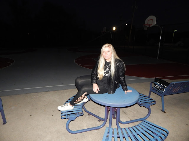 Hello, lovelies! We are back to focusing on outfits this week! This look does stray a bit from my usual personal style, but I still love it. And that is the power of fashion; style has no definition. You can be super feminine one day, and the next day be grunge…style reflects who you want to be and how you want to feel, and it’s always changing! Okay…enough with the words of wisdom! I wanted to go for a sporty look that has an edgy vibe because it’s fun to have something a bit refreshing in the midst of all my skirts and dresses. I kept it pretty simple; an oversized logo tee, black denim shorts (they are underneath, but you can’t really see), some sneakers, and a few extra pieces I added (jacket, leggings), if you just keep scrolling!