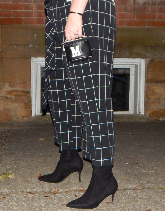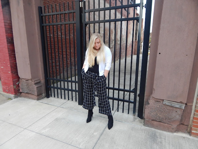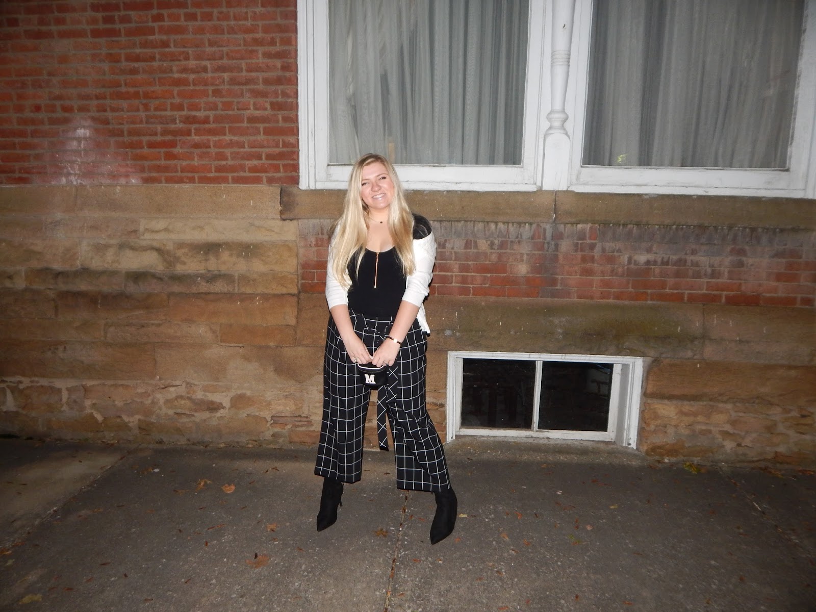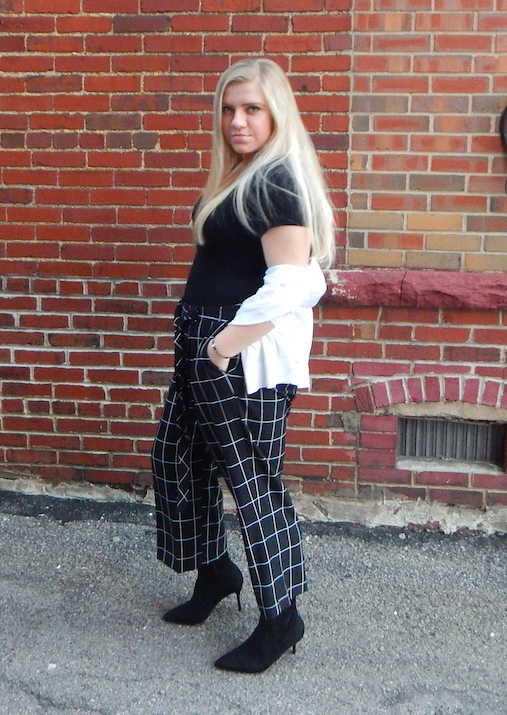 Hey there, fashion lovers! This week is another black and white look, however, it’s on the fancier side. I have been anxious to wear all of the new things I bought, and everything just so happened to go together! I am happy to announce that I jumped on the bodysuit bandwagon, pairing it with grid-print culottes, a white sweater, and black sock booties. To top it off, I grabbed a micro bag (which you may have to squint to see) with my initial on it. This look is unique because it mixes different trends, but also has timeless elements.