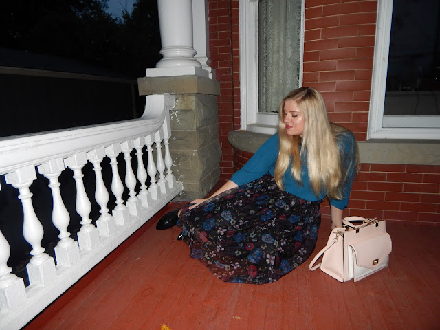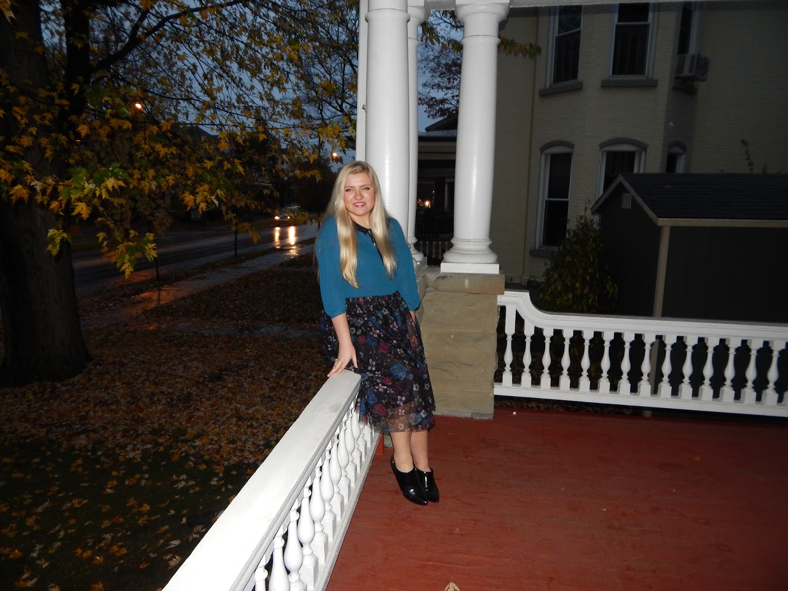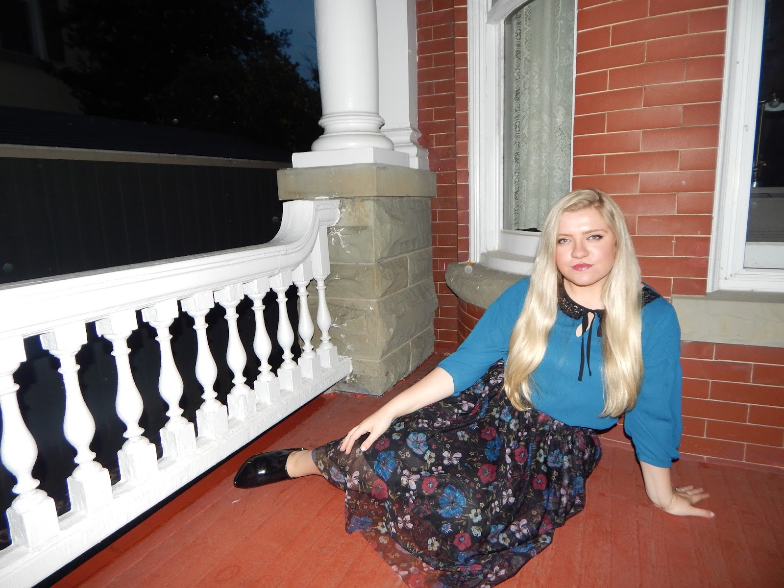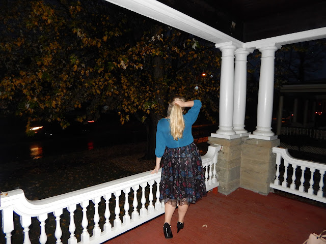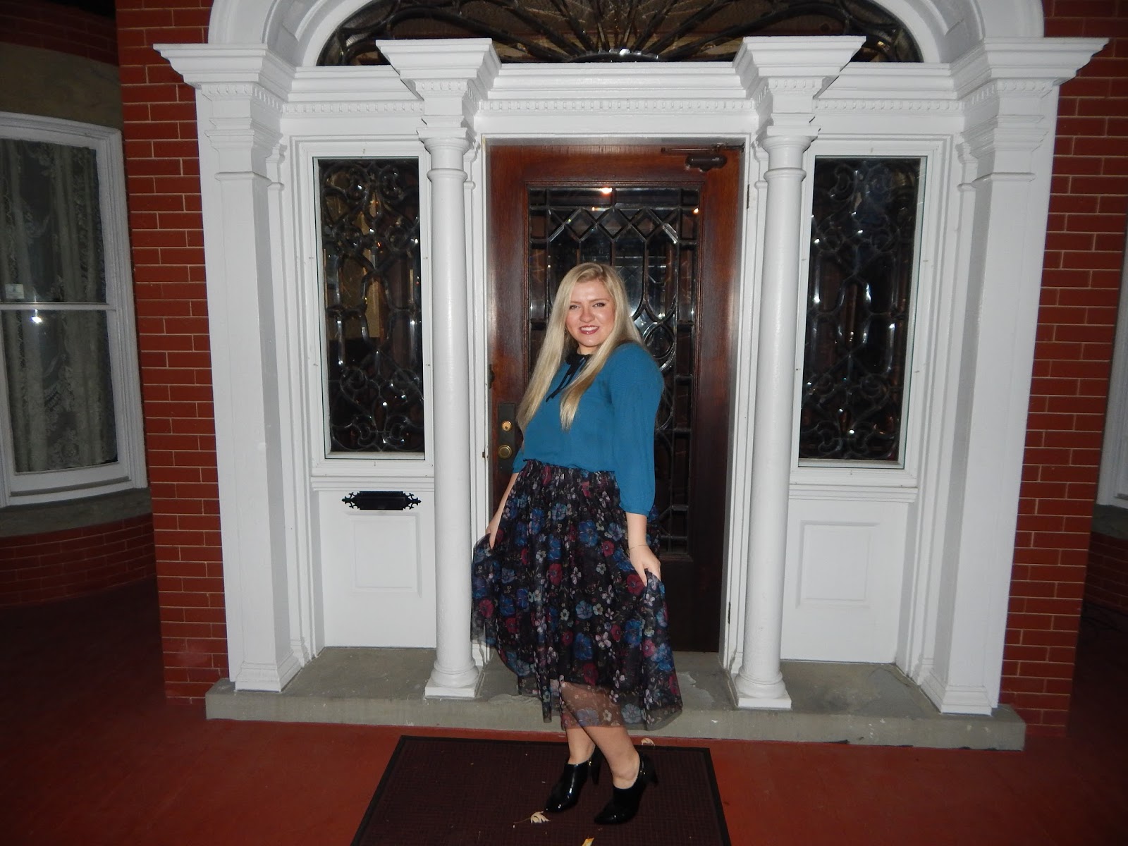 Hello loves! While you are all preparing your Halloween costumes, I am delivering some whimsical outfit inspiration. The cold weather is finally sticking around in Western Pennsylvania…but no need to fall into a slump. Cold weather means more coats, boots, and fuzzy accessories. But, the chilly air doesn’t mean you should put away those skirts! I feel like a princess (like Snow White even though I have Cinderella hair) in this outfit, especially with the beautiful architecture in the background. I felt like I went back in time for this shoot because the outfit has vibes from the Victorian era. I went with this midi skirt that has darker fall/winter colors, a teal blouse, and patent leather black booties. The length and fullness of the skirt and the black lace collar represent some Victorian elements, but the floral pattern is darker and more modern, and the outfit shows a little more skin than what Victorian women did. It is a perfect combo of old meets new. Wear it to work, school (you may want to go with flats!), or any occasion where you want to portray femininity and grace.
