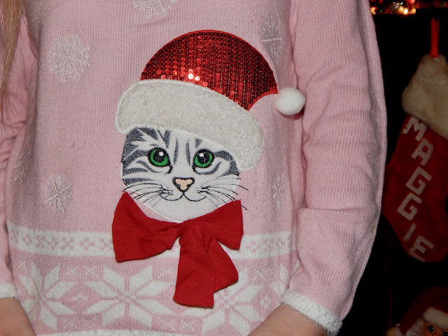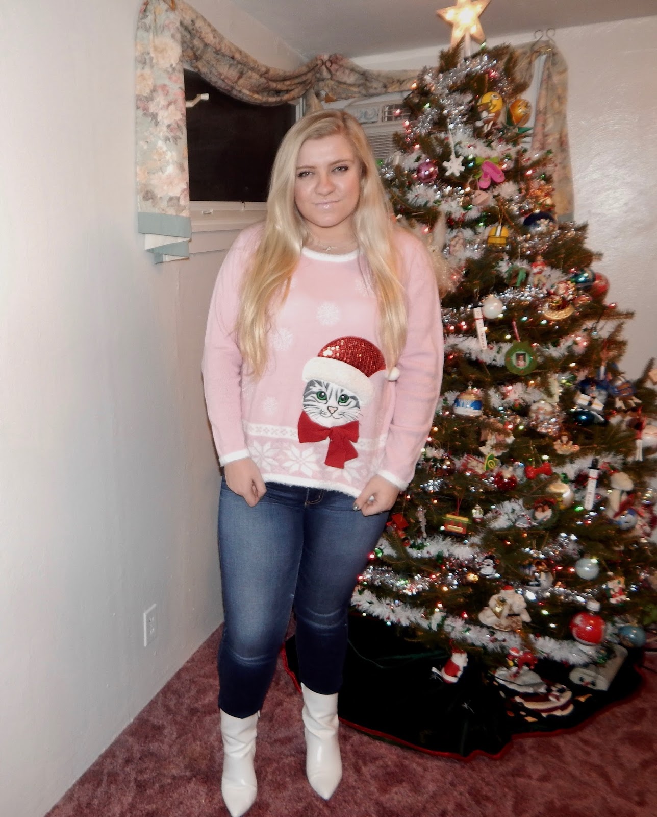 Hey there, everyone! This week, I took a break from the cold weather, staying indoors (you will have to excuse the air conditioner that creeped into the background) and decorating while wearing a casual outfit. Yes, the holidays are filled with lavish parties and events, and I love to break out my fanciest pieces, but we also get a little down time and want be comfy and cute. I started with a holiday tradition, a.k.a. a Christmas sweater, my favorite jeans, some trendy little white booties, and I even threw on my pink Santa hat! This look is great for spending relaxing evenings with friends and family, decorating, sipping hot chocolate, and getting into the Christmas spirit. You could even wear this look to some ugly sweater parties (even though this sweater is far from ugly)! I will say that this is definitely a nod to all my cat lovers out there, however, you can find Christmas sweaters that feature all kinds of animals and styles. Keep reading to see how to make your fave sweater of the season look equally chic and festive!