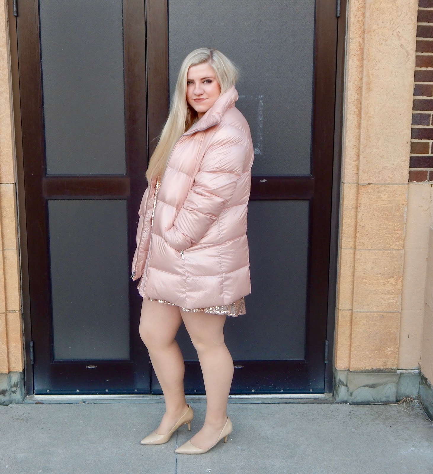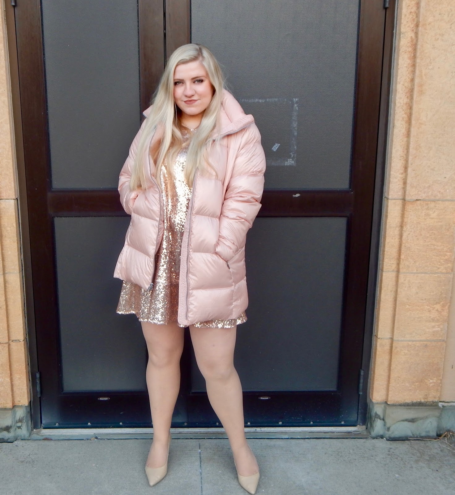 Hi everyone! Hopefully you are all enjoying the holiday season because the fun festivities continue. Yes, Christmas is over, but 2017 is almost over, too! And you know what that means; New Year’s is right around the corner. When I think about ringing in a new year, the first thing that comes to my mind is SPARKLE! New Year’s Eve is the time to bust out your most fabulous, glamorous pieces and unapologetically strut your stuff. You might as well live like a movie star on the last day of the year! I am getting ready for my New Year’s debut and am taking advantage of the glitz in this look with a sequin, rose gold babydoll dress, nude heels, and bold earrings (plus a puffer coat for the 10 degree weather)! My outfit looks fancy, but it so comfortable that you can party the night away and say cheers to 2018. So, if you are interested in approaching the new year in style, keep on reading!