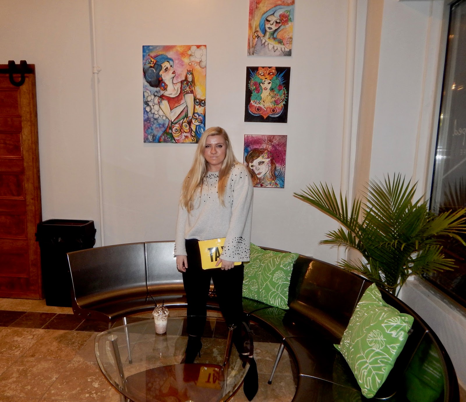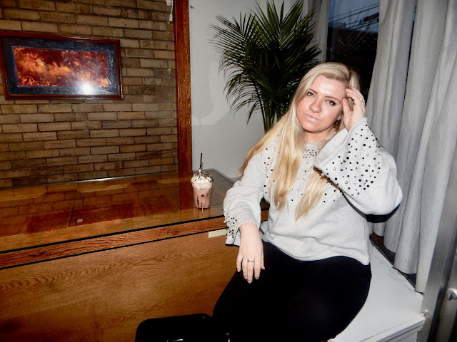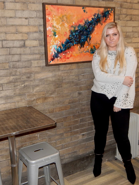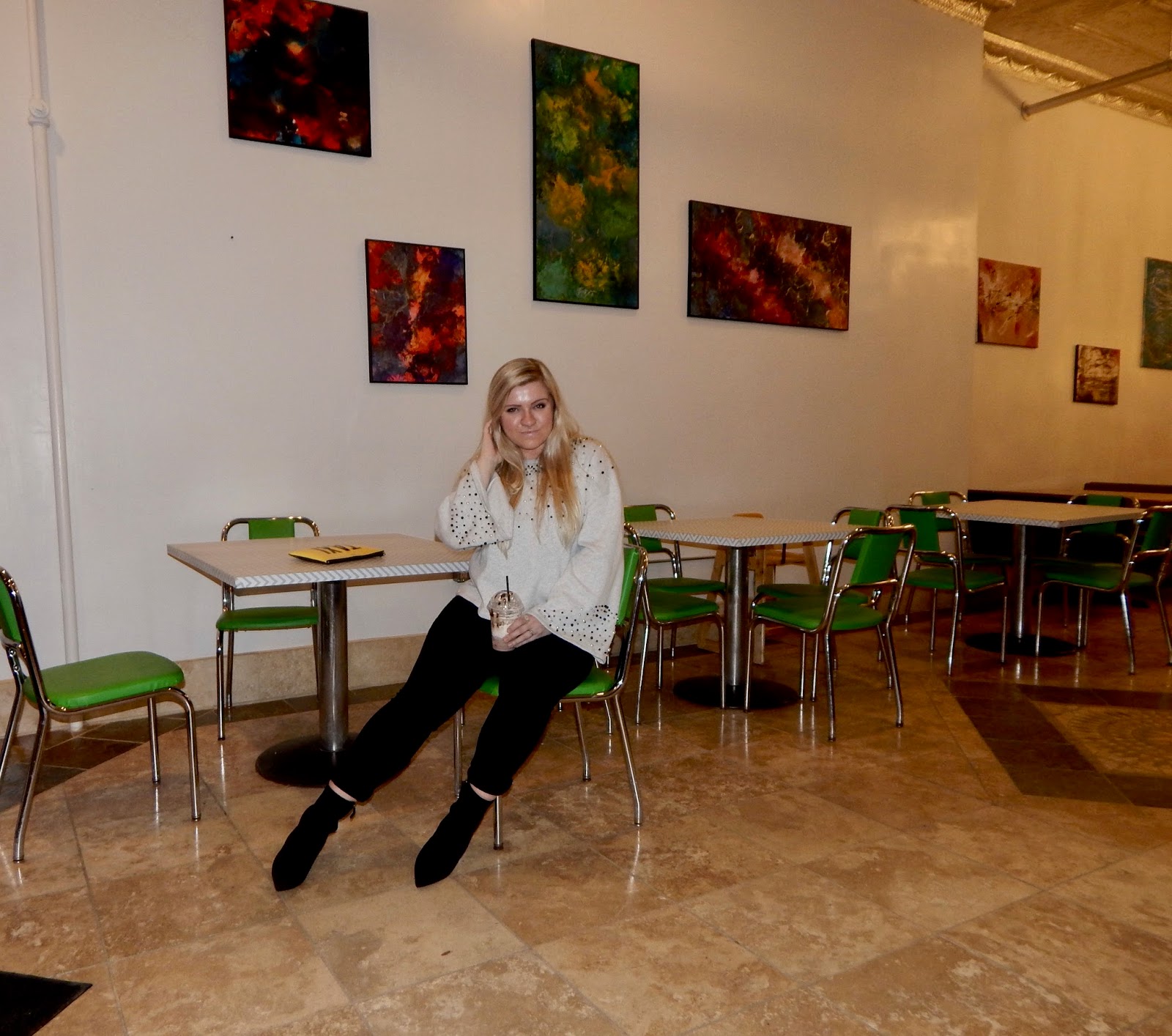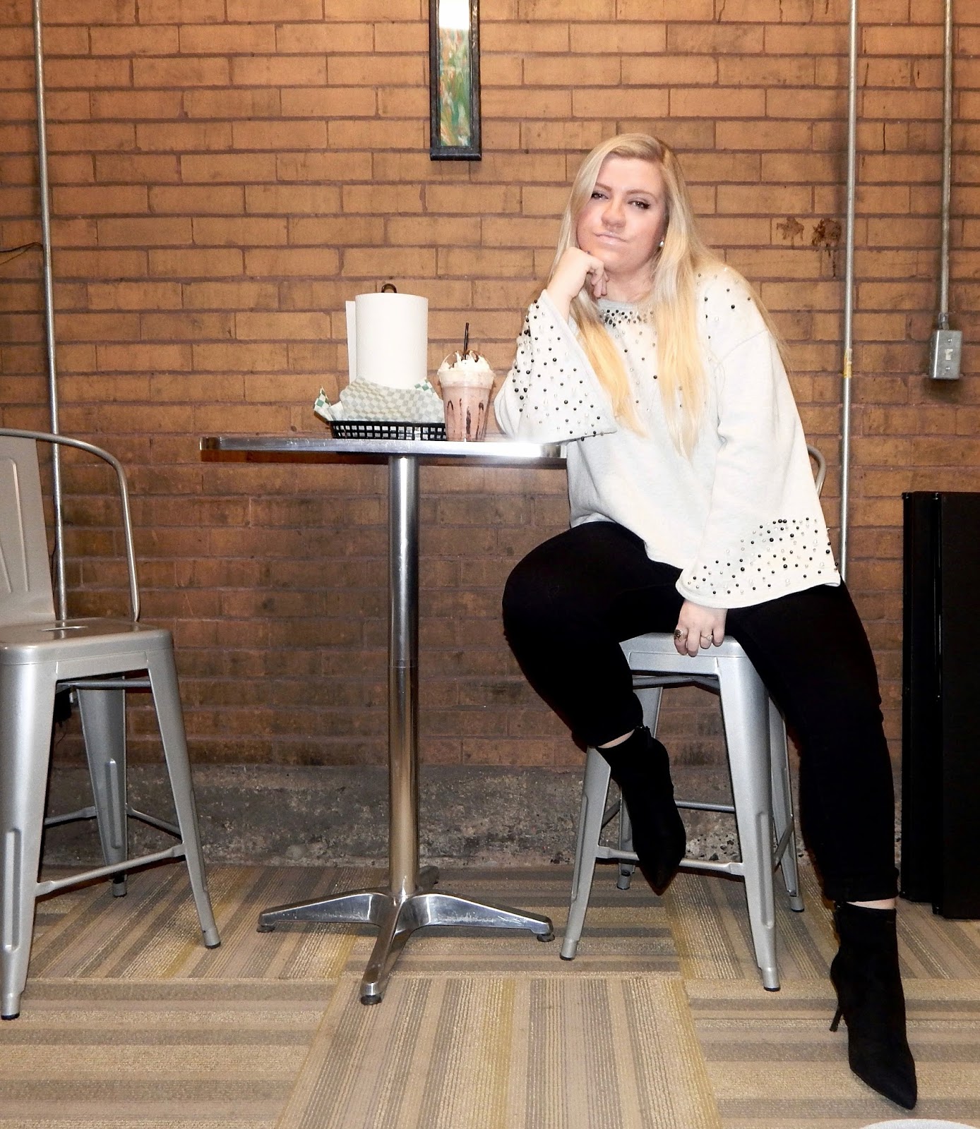 Before I start raving about my jeans, I wanted to mention my location for this shoot. The Ginger Snapped Bakery and Café in Punxsutawney was the perfect place to photograph my look because of their fun aesthetic. The exposed brick, artwork, and bright colors make for such a great atmosphere! I highly recommend popping in for sweet treats and yummy drinks. Obviously, I never wanted to put down my frozen hot chocolate because it makes a cameo in lots of shots (yes, it’s cold outside, but it is my fave drink)!