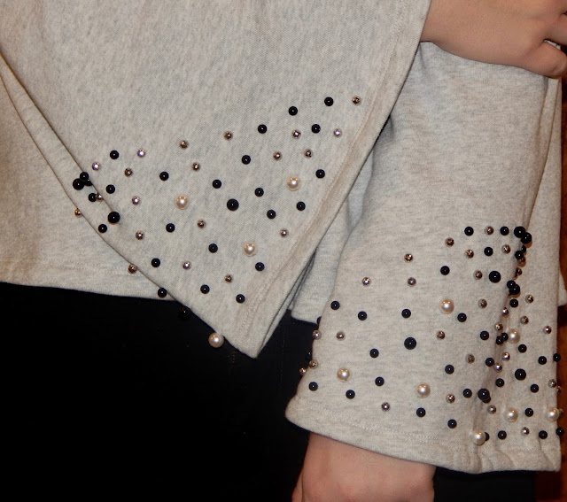 As much as I appreciate minimalist dressing, I can’t help but fall in love with anything embellished. Needless to say, I naturally gravitated to this sweatshirt when I saw it on the racks. (It is actually on sale right now at Nordstrom!!!) I have to admit that I usually just wear sweatshirts when I have a date with the couch, but this one was meant to be seen. It is extremely comfortable because the sweatshirt material is undeniably soft, but the feminine and trendy bell sleeves, along with the gorgeous pearls, studs and black beads, make this top a stunner. I really love that type of contrast; a casual lounge piece mixed with fun details. The heather grey color is a classic, but the silhouette of the sleeves add drama and help to reinvent a favorite. You can wear this top with a bold metallic heel, booties (totally a bootie with a pearl heel!), and even sneakers. There are so many elements that make this so versatile that it can be styled in many different ways, depending on personal preference.