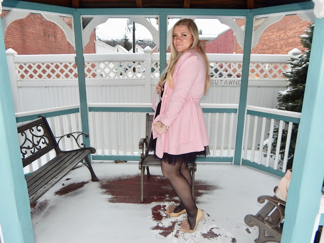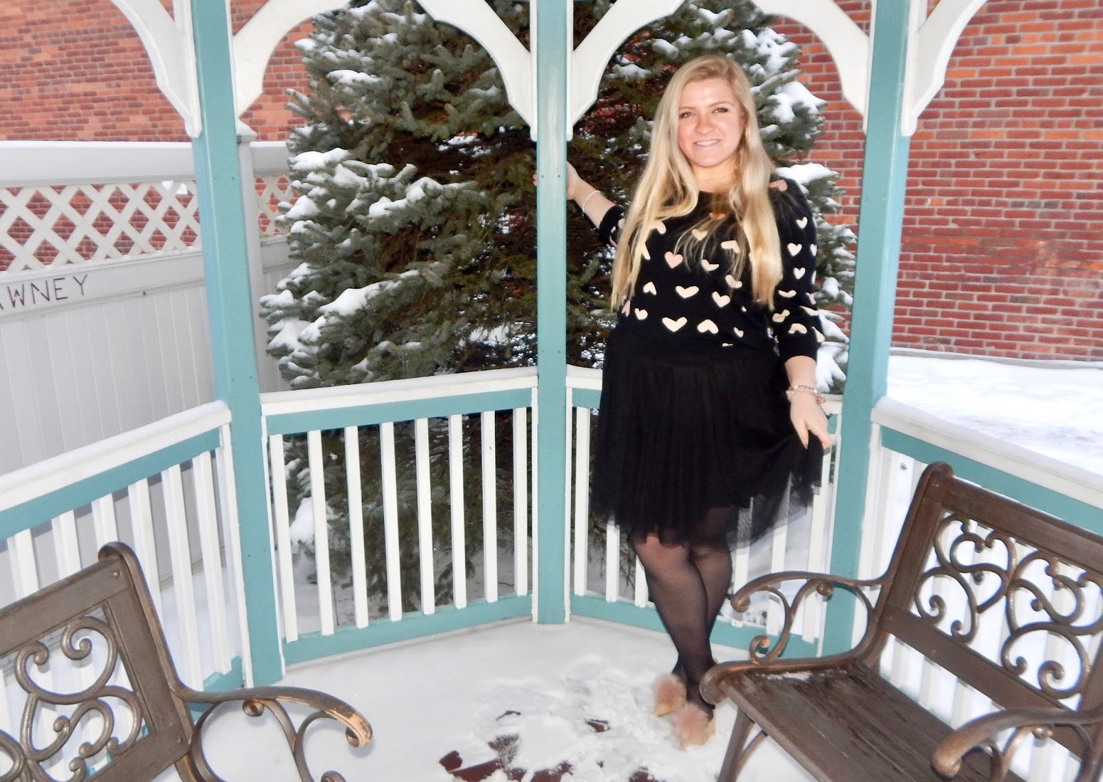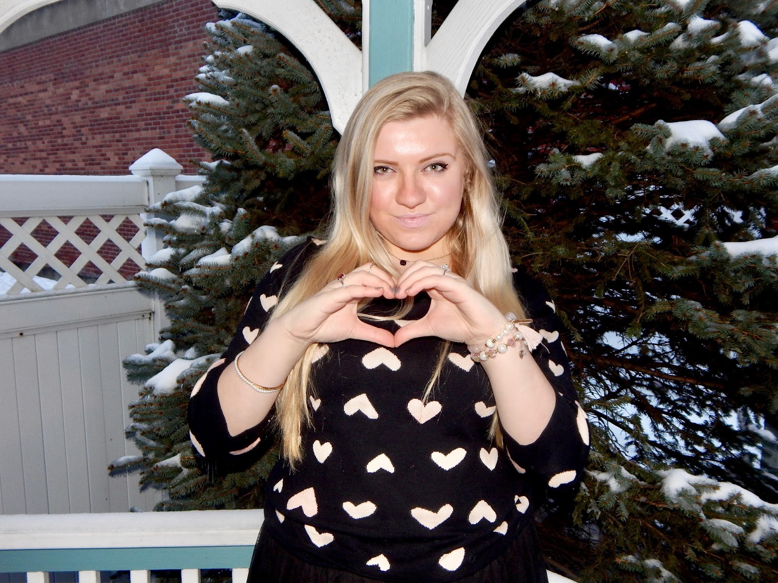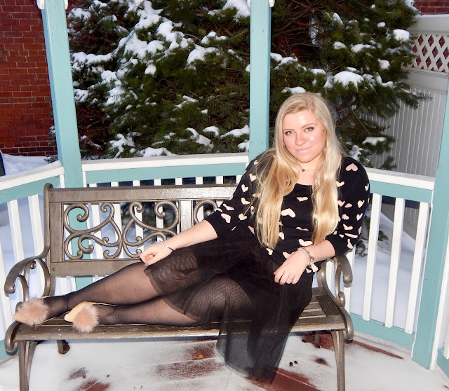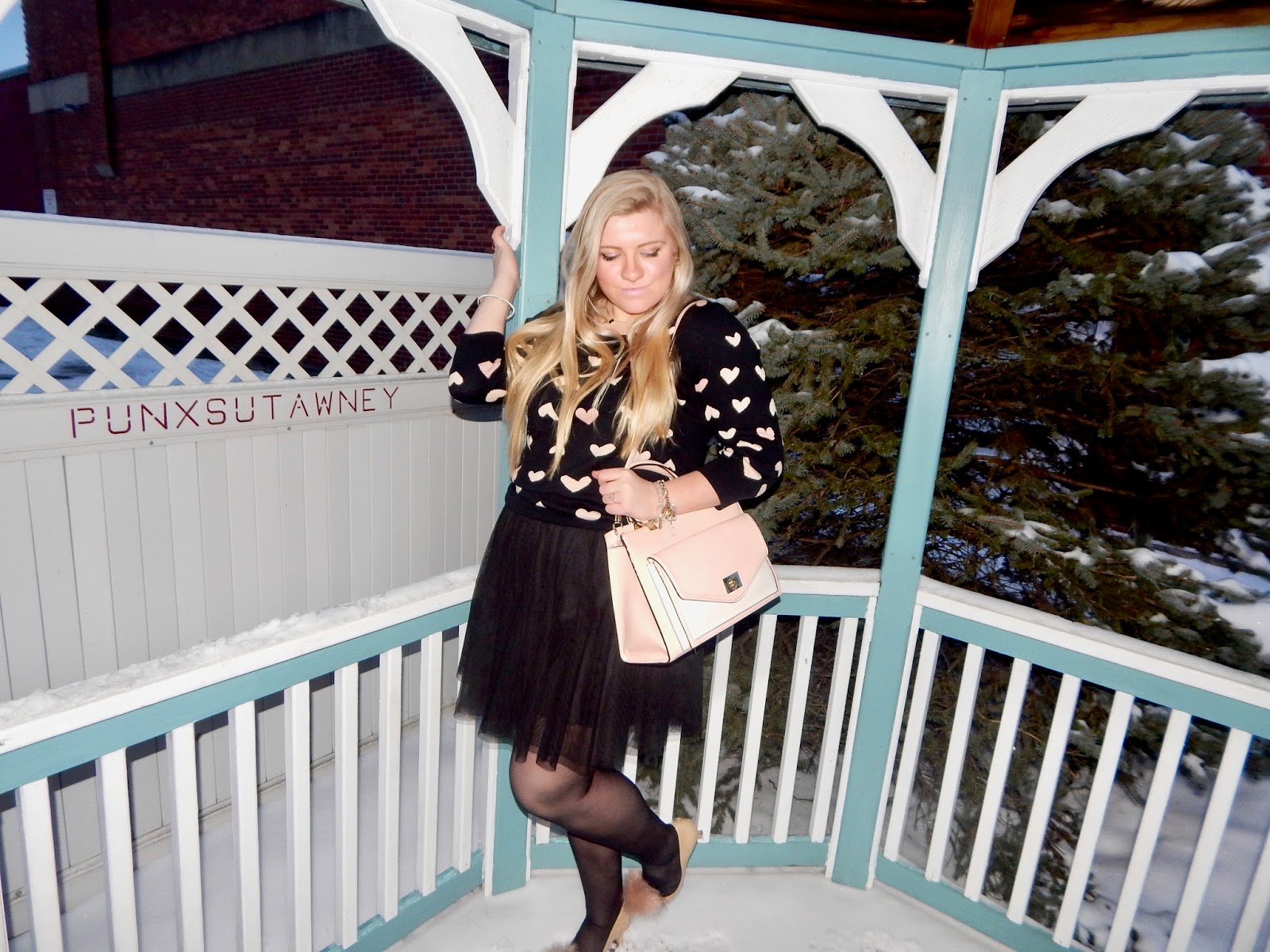 Hello lovelies! I apologize for being M.I.A. last week; it was Groundhog Day weekend and being from Punxsutawney, I took time to celebrate (plus it was freezing…not great photography weather)! Clearly, Phil was correct when he said six more weeks of winter, but instead of dwelling on the cold, I am focusing on the next holiday; Valentine’s Day! Whether you are going out, staying in, or just riding solo, you can always use a festive outfit. I chose to do a more subtle look for V-Day, wearing a black sweater with hearts, a tulle skirt, some nude pumps with pom poms, a blush purse, and a bubblegum pink coat, too. Okay, I guess “subtle” is all about interpretation! I didn’t want to wear red and pink head-to-toe (even though that is a great color palette), so I added a little black to the mix, all while sticking to a romantic theme. So, keep reading for details on how to do Valentine’s Day the oh so chic way!