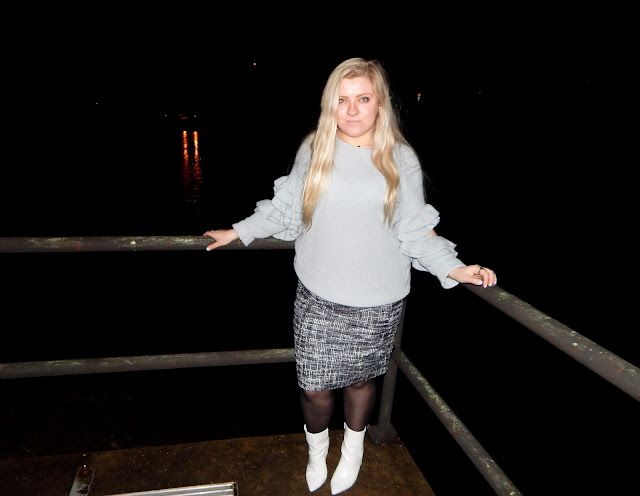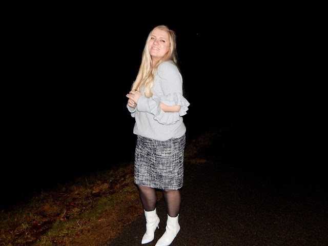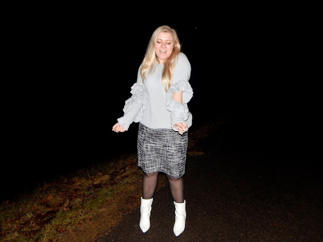Hi my loves! I hope to refresh your cold weather wardrobe this week with a fun look that is sure to cure any winter blues. So, what’s the best cure? Ironically wearing blue! I want to point out the fact that I am finally wearing more color this week because even though black is obviously fabulous, we all need some different hues to brighten up our looks. This outfit of mine will certainly inject a little personality into your closet with this ruffle, cutout sweater, tweed skirt, and futuristic white booties. I am taking the pencil skirt you wear to the office and putting an entirely new twist on it with pieces that not only deserve attention, but demand it. It is an ensemble that will ruffle some feathers…or I guess ruffle your sweater, but all in a good way! Keep on reading to discover how I style this whimsical sweater in a flirty, yet chic look!