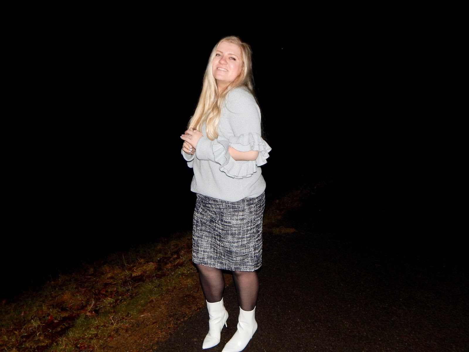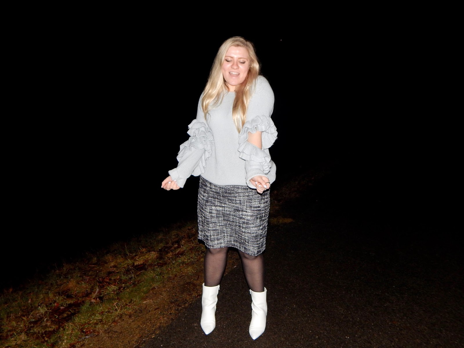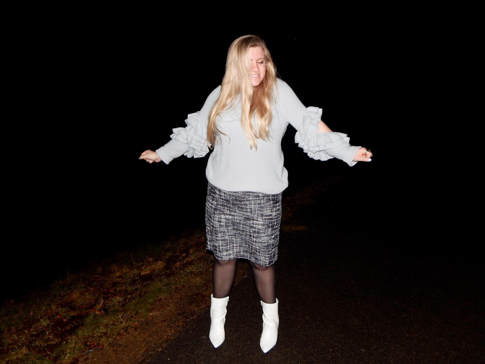 Hi my loves! I hope to refresh your cold weather wardrobe this week with a fun look that is sure to cure any winter blues. So, what’s the best cure? Ironically wearing blue! I want to point out the fact that I am finally wearing more color this week because even though black is obviously fabulous, we all need some different hues to brighten up our looks. This outfit of mine will certainly inject a little personality into your closet with this ruffle, cutout sweater, tweed skirt, and futuristic white booties. I am taking the pencil skirt you wear to the office and putting an entirely new twist on it with pieces that not only deserve attention, but demand it. It is an ensemble that will ruffle some feathers…or I guess ruffle your sweater, but all in a good way! Keep on reading to discover how I style this whimsical sweater in a flirty, yet chic look!
