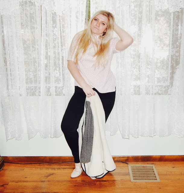 Under the sherpa, I wanted to wear some color and figured I should just add another print to the mix! I wore this turtleneck that is perfect because it has short sleeves! I am a complex human who is always cold but manages to somehow also get hot real quick, so I love love love the short sleeves. Because I am wearing this with a rather warm jacket, the sleeves work for me, but if you opt to wear this by itself, or you plan on being out in the cold for a long time, then by all means, get full length sleeves. I also love the baby pink color because it complements the jacket, and the little black polka dots aren’t too busy either. You can wear a turtleneck of any color, so you could try some pastels like me if you want to be in the springy mood, or you can rock a richer color like mustard. The turtleneck is a piece that looks so great and refined, and I like how it sticks out from underneath. Though it has taken me years to warm up to them, they truly are a wardrobe essential.