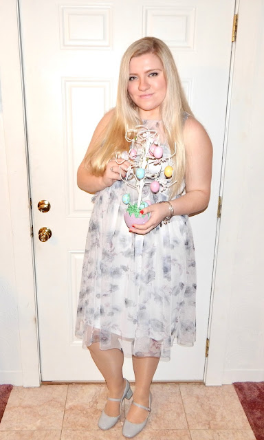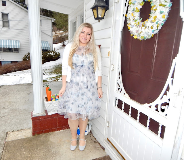 Hey my loves! I am being a little cheesy with my title, but I really am egg-cited for Easter. It is a holiday that signals warmer weather is coming and, more importantly, allows us to start to shed some layers. Ironically, it was very cold the day I took these pictures, so I had to make a new plan and shoot most of them in my house. I luckily have some pretty green walls that remind me of spring pastels. Speaking of pastels, this week I chose to wear a pale blue dress with sheer floral detail, a white sweater, and some block heel Mary Janes to create a feminine look for any Easter celebration or spring day. This look is super comfortable, so it is also great to wear when you just may eat a little too much chocolate. Who am I kidding? There’s no such thing! Now here I am getting a chocolate bunny craving when I am supposed to be talking about clothes! It is probably best that I hop (get it?) right into the outfit details!