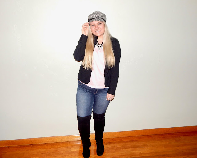 Hey there, lovelies! I’m back and ready to talk about fashion! Before jumping in, I hope that those of you who celebrate had a wonderful Easter last week! I sure did… except for the fact that it was so chilly, the people at my church were filing in in winter coats. I can’t say I blame them, though, because the cold is sticking around! I know I said I am looking forward to spring, but no matter how many new dresses I buy, I can’t seem to stay out of my winter clothes. Phil wasn’t lying about 6 more weeks of winter (or was he? It’s definitely been more than 6 weeks, Phil!). I always feel the need to give the weather report on the blog because it greatly influences my outfit choices. With that being said, even though my look is best suited for chilly weather, I will give you tips on how to achieve a similar look in warmer climates. But for all my bundled-up babes out there, I would stick to the same black military jacket, pink tee, statement necklace, jeans, over-the-knee boots, a bag, and a newsboy cap, of course! If you couldn’t tell by the title of the post, this week I am paying homage to one of my favorite hats! So, keep reading to see how I dress for whatever season you want to call this, and learn how to style a hat that requires no newspapers to rock (but a few fashion books wouldn’t hurt)!