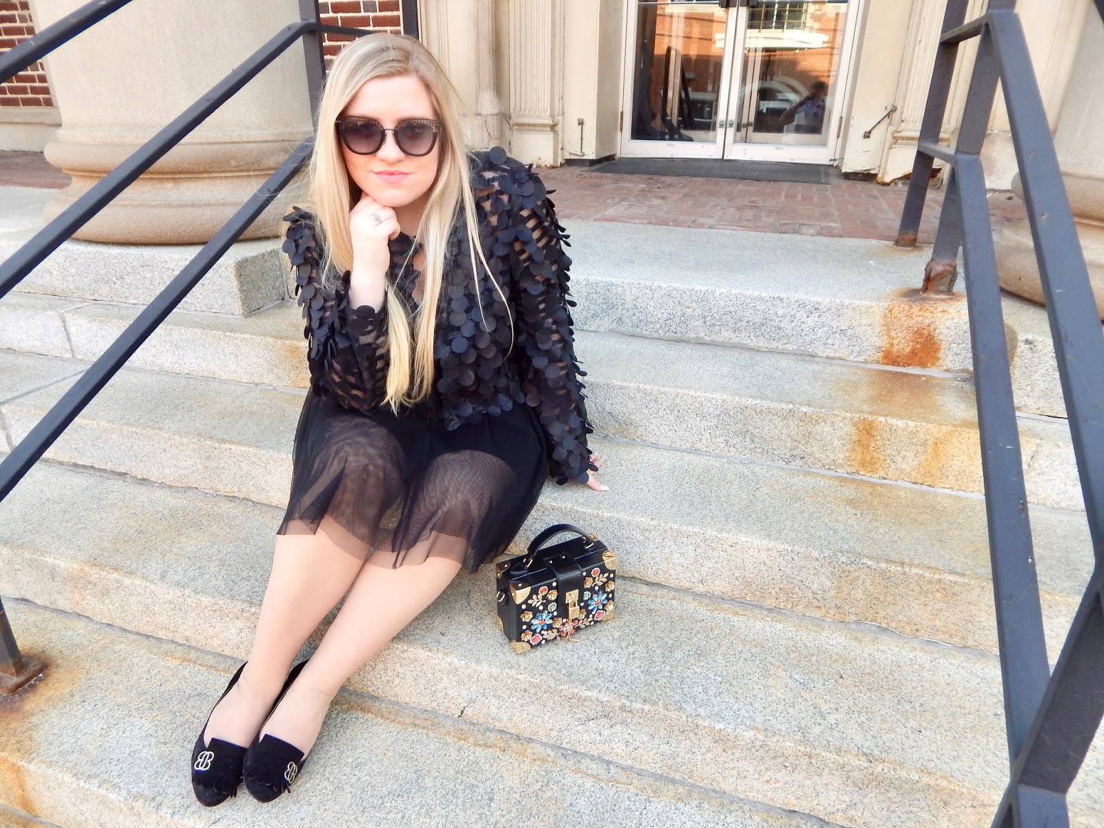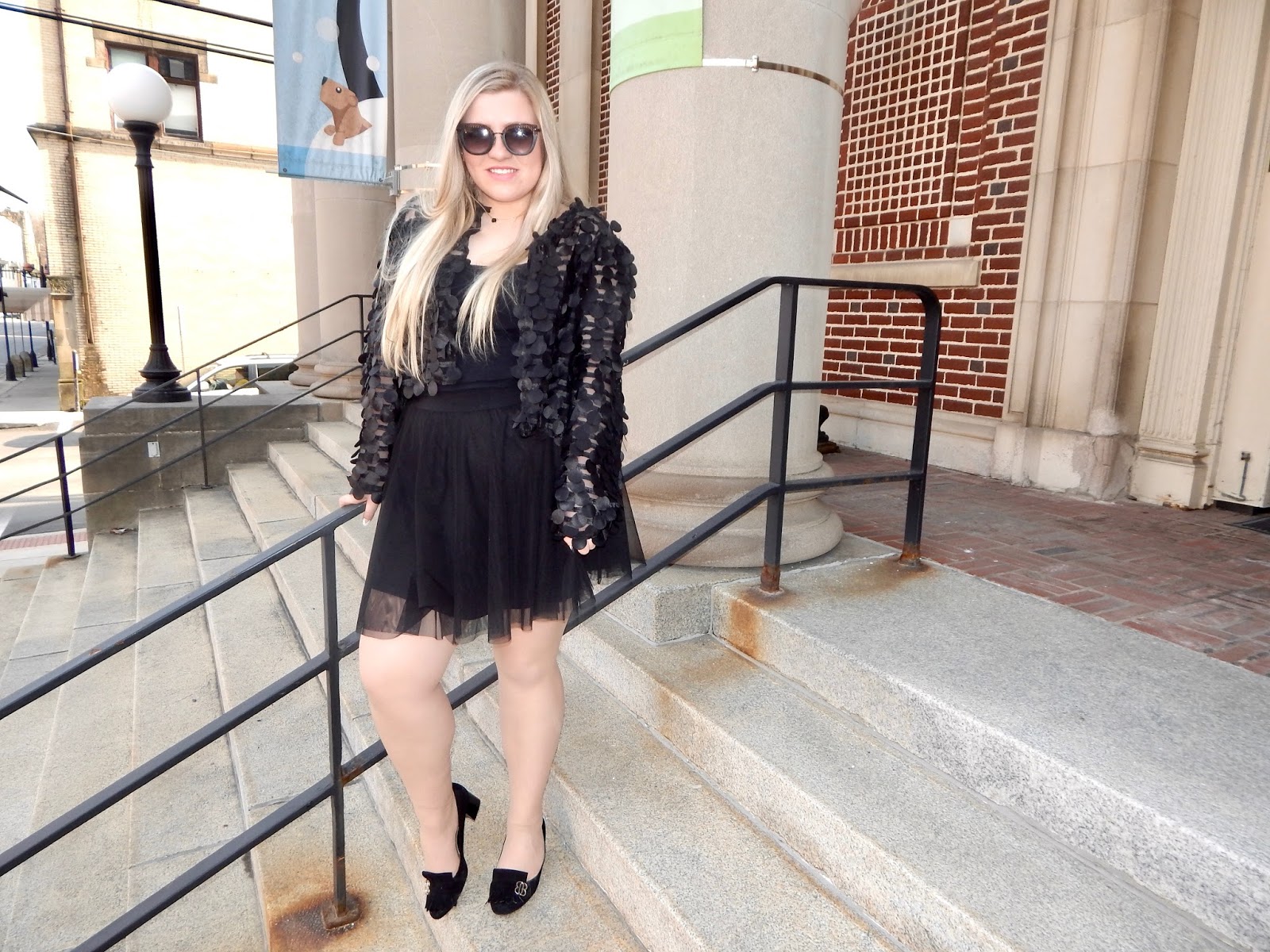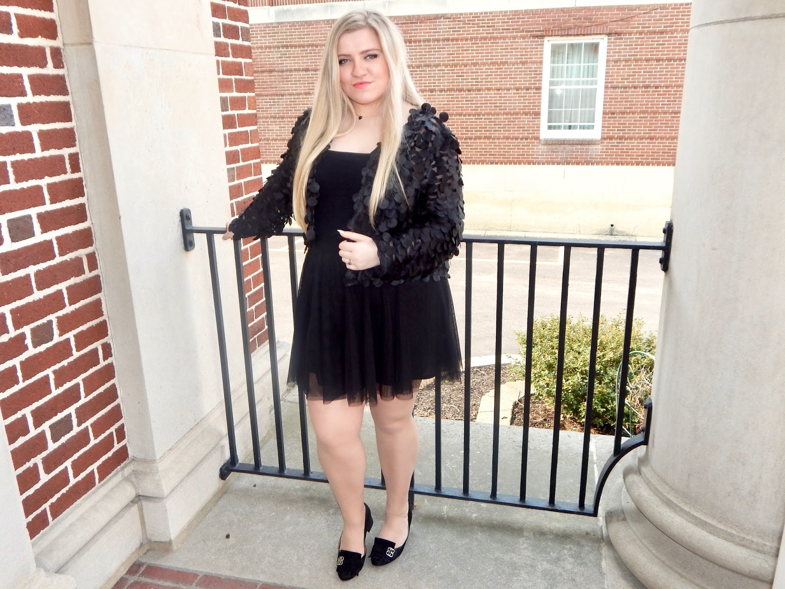 Everyone knows you can’t walk around with a jacket and nothing underneath. Under my circle-scaled creation, I wore a black cami and tulle skirt. I chose a black cami because the jacket stands out when you have more skin showing. Any color would look great paired with this piece, so you can go with white, yellow, blue, pink, green, purple, etc., but I kept things basic by sticking to a theme. I wanted the jacket to be fully on display, and sometimes all black is the answer. Plus, there are so many different textures going on that you don’t want to overload on crazy color combos because less is more, in this case. I threw on this skirt because 1. I love to dress up, and this jacket feels ready for a party, and 2. I am trying to live like Blair Waldorf, sitting on the MET steps and just being fancy. Sorry for more TV references, but I couldn’t help myself! Is it bad that I started watching Gossip Girl a year ago and haven’t finished it yet? Anyway, the Weather Center in Punxsy is as close as I could get to the MET, but I can still be as dressy as ever. The tulle, like I said, adds more texture and interest to the all black ensemble. It also has a sheer quality like the mesh, tying everything together. If you want some options, you can pull from those closets and wear this with a cotton skirt, culottes, or cigarette pants.