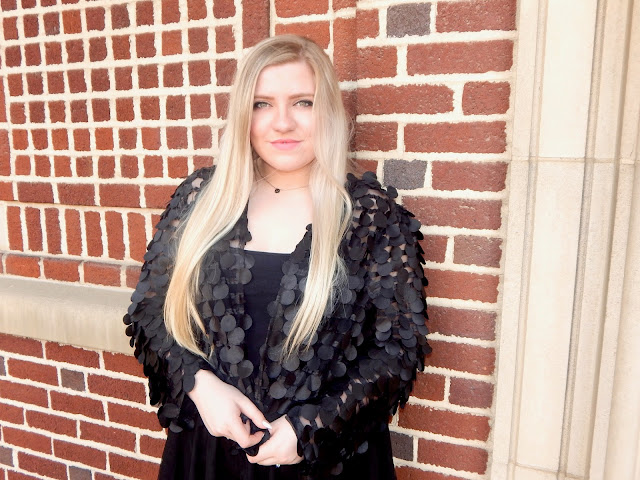 There is so much to say about this jacket, but I am going to start off by pointing out how unique it is. That is truly the best part about sewing; you have the ability to make things that you can’t find on the racks. I have to admit that I have plenty of ideas in my head, but not enough time! When finals are over, I am hoping to speed up production! Anyway, I bought this crazy fabric at a great sale, and I let it sit by my machine for a year and a half before I decided to take the plunge. All I knew when I bought it was that I needed it in my life. This fabric is a black mesh with 3D circle “scales.” After contemplating different ideas, I came to the conclusion that it would be the perfect textile to turn into a jacket because I could throw it over anything and make a statement. I bought a pattern for a really basic jacket and didn’t even follow the instructions! First, I essentially chopped the pattern in half because I wanted a crop style. Then, I cut out only five pieces; the back, two front panels, and two sleeves. I skipped sewing in interfacing and bias tape because I wanted it unlined and not a structured fit. Can you believe it was the first time I ever sewed long sleeves? Honestly, I was really nervous to work with this fabric because it is very thin, and the circles proved to be a little problematic to hem and make even. But, once you start, you see the piece come to life and all of your fears go away. Sounds like a fairytale, I know, but it is really just sewing. The most difficult part turned out to be the hemming, as predicted, especially around the neck. A nice feature, however, is that the fabric is so busy, so it is okay if your stitching is a little off. A few more things you would want to make note of if you aim at creating a similar piece; I set my machine, the Husqvarna Opal 650 to the “light woven” setting, as well as used a universal needle. The mesh is great for spring because it is cool when the weather is warm…so buy some fabric and get to creating!