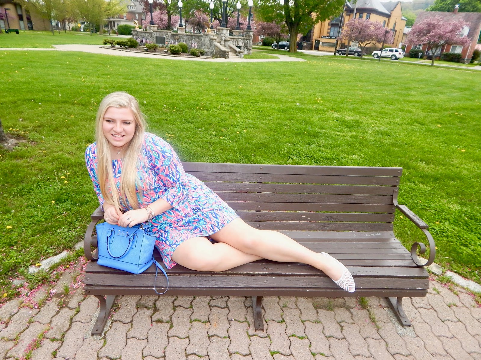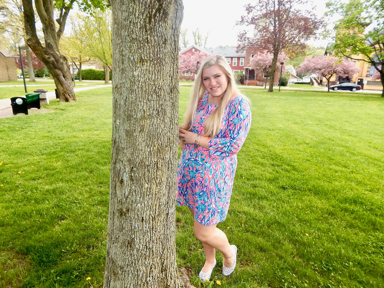Hey my loves! It is officially summer for me, so no more finals/college talk! To kick off my vacation, I decided that I needed some fresh air at Barclay Square, my local park. I was so happy to see all the gorgeous blooming trees that I attempted (see above) to climb one as best I could in a dress, with the wind whipping. Trust me, there were a lot of shots in which my face was covered by my hair because the gusts were intense! There was sun, a storm, wind, and more sun, but we got the pictures! For my look, I threw on the perfect dress for the spring/summer season. I wore a brightly colored Lilly Pulitzer dress, a matching purse, jelly shoes, and some sunnies, of course, to top it all off. I love this look because it is so cheery, easy to throw on, comfortable, and very chic—basically everything you could ever want in an outfit! Clearly it withstood my afternoon adventures, so it can do the same for you, whether you are shopping, brunching, working, or spending time outdoors. Keep on reading for details on how to play in Pulitzer in the park in Punxsy (try saying that five times fast)! Or just keep reading to learn how to style the dress with no tree climbing required!