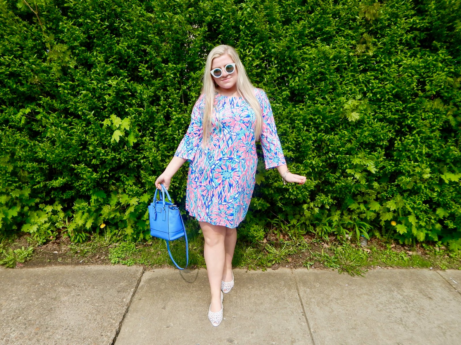 I also have details about my purse, but I will make it brief because I have featured this bag on the blog before. It is not a boring piece, but I don’t feel the need to ramble! This bag is Kate Spade, and I showcased it with the look because it goes so well! The blue shade is almost identical to the colors in the dress, and I can’t help but love that coordination! Colorful bags are great, particularly in the summer, so don’t be afraid to break out the brightest of bags to go with your next outfit!