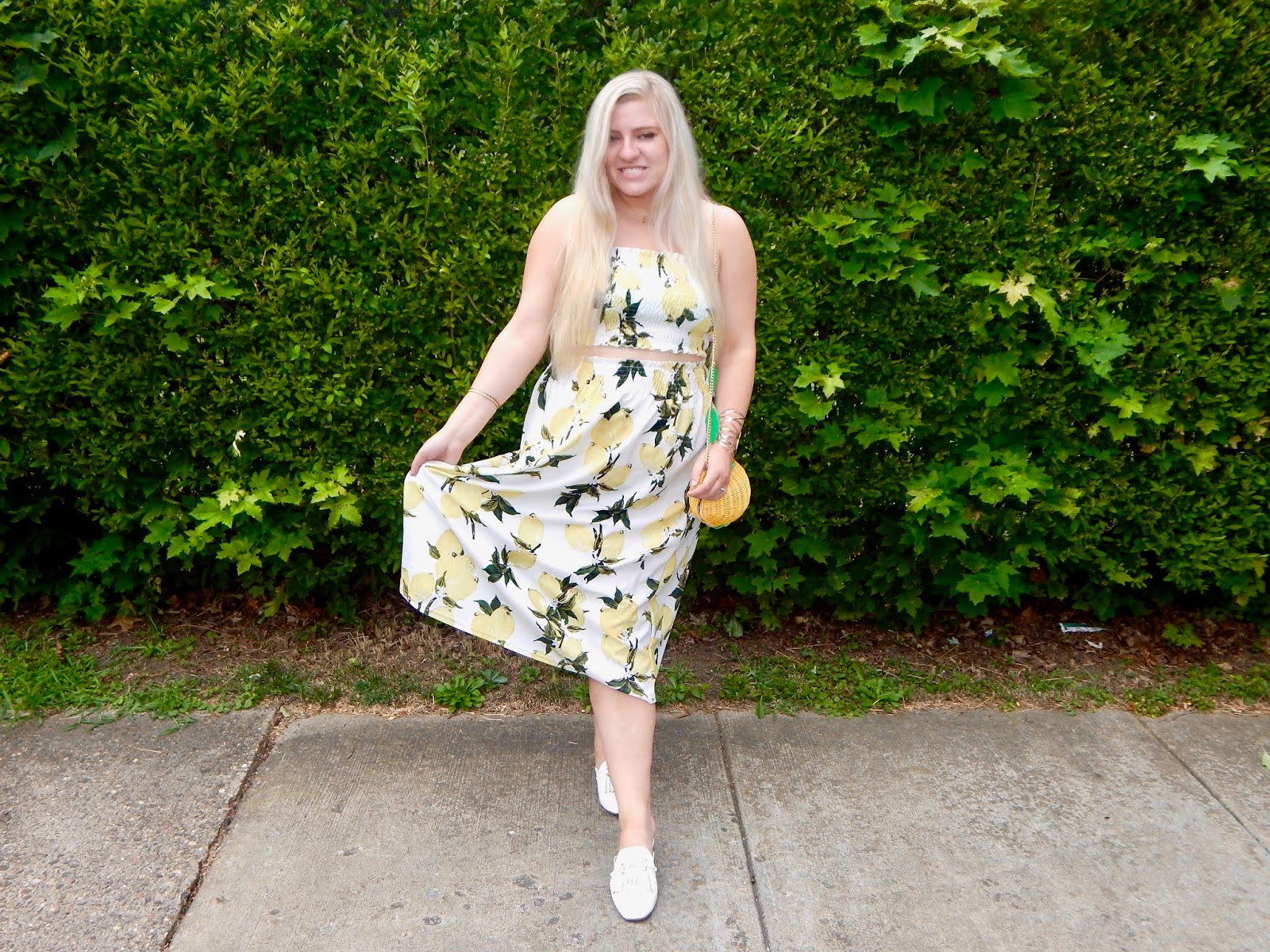 Hi lovely people! I promised that I still had some fruity fashions up my sleeve, and this week, I live up to my promise. I thought now is the perfect time to bust out my citrus fruits because it’s undeniably hot, and this weather has me craving lemon(ade)! Instead of complaining about the heat, I embrace it and grab all my lemon gear. I wore a two piece set, white mules, and accessorized with a lemon bag and lemon earrings. Yes, you read that correctly—when I commit, I commit! This fun and flirty outfit is great for numerous summer activities and occasions; I can definitely say that it is picnic approved because I wore this look for an outdoor get together and it was a hit! The fact that it is stretchy is a big bonus, especially when the ice cream truck shows up at the picnic. I am sorry, but nobody can resist dip n’ dots or the ice cream man! Aside from being a great look to grab sweet treats in, you can also wear this out with friends, on vacation, to a concert, or just for a stroll in the neighborhood. You don’t need to have extravagant plans to look cute. After all, they always say that there is no such thing as being overdressed! So, keep on reading for my style advice about the last look of my fruity fashion series of the summer (cue the tears). You all know, when life gives me lemons, my favorite thing to do is wear them!
