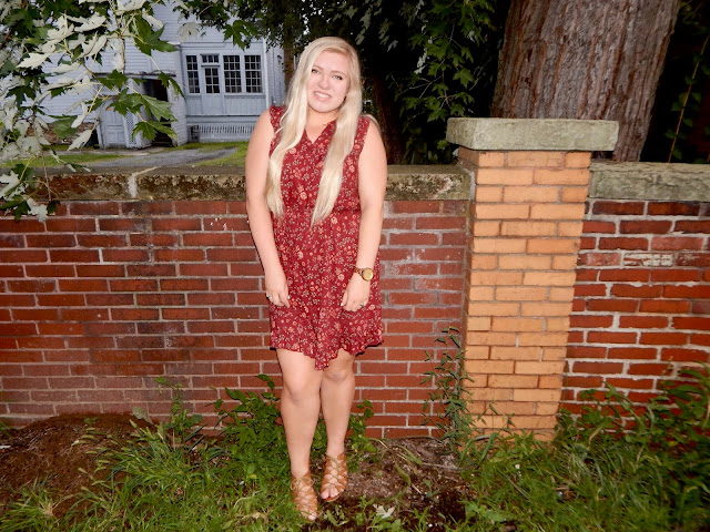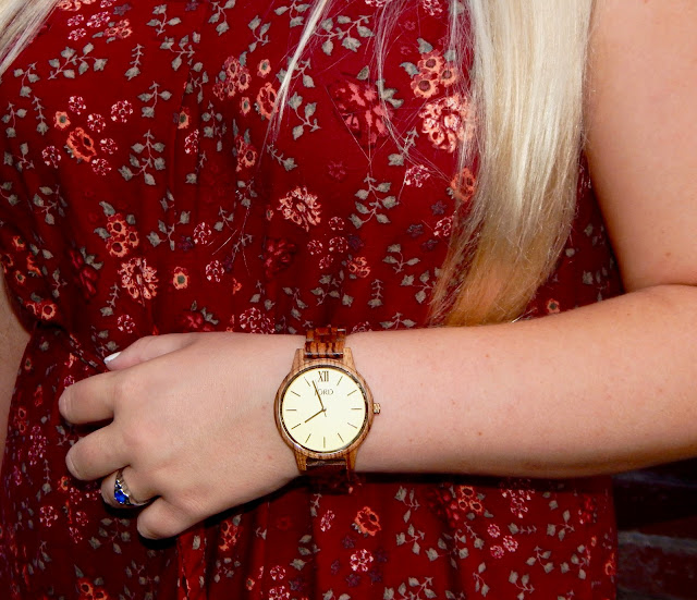 Just as every outfit needs an accessory, every accessory needs an outfit! I styled my watch with a printed dress because it is simple, casual, and most importantly, comfortable! The rich berry color, along with the various shades of orange and olive in the floral print, beautifully complement the wood watch. It is the warm hues that bring out the natural colors of the material, so you can tell that the dress and timepiece are a match made in heaven. The dress ties at the waist, making it a super flattering silhouette that looks great on everyone. Just as JORD pays attention to the details, this dress does too. For example, the slight ruffle at the hemline is a feminine touch, yet the piece is still very refined. Florals are timeless (get it?) meaning you can never go wrong when you opt for a flowery print. This print in particular is not overbearing, but it is fun and youthful. Basically, I believe this dress mimics the vibe of the watch because it is simple, but detailed and classic with a few little twists!