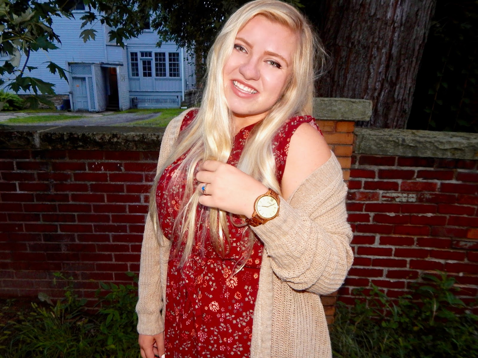 Just as every outfit needs an accessory, every accessory needs an outfit! I styled my watch with a printed dress because it is simple, casual, and most importantly, comfortable! The rich berry color, along with the various shades of orange and olive in the floral print, beautifully complement the wood watch. It is the warm hues that bring out the natural colors of the material, so you can tell that the dress and timepiece are a match made in heaven. The dress ties at the waist, making it a super flattering silhouette that looks great on everyone. Just as JORD pays attention to the details, this dress does too. For example, the slight ruffle at the hemline is a feminine touch, yet the piece is still very refined. Florals are timeless (get it?) meaning you can never go wrong when you opt for a flowery print. This print in particular is not overbearing, but it is fun and youthful. Basically, I believe this dress mimics the vibe of the watch because it is simple, but detailed and classic with a few little twists!