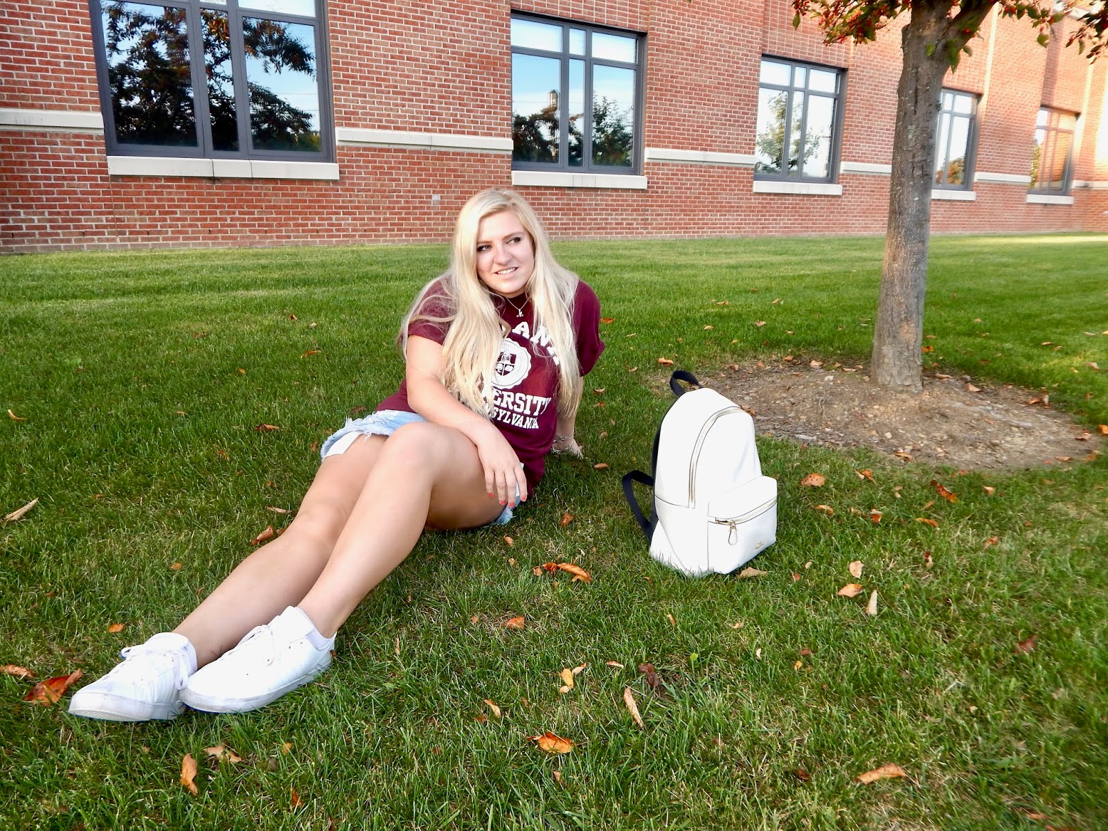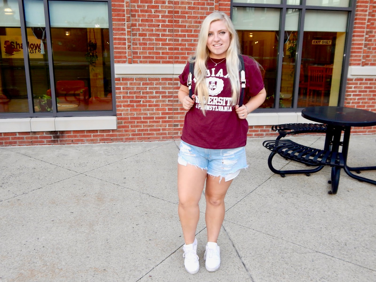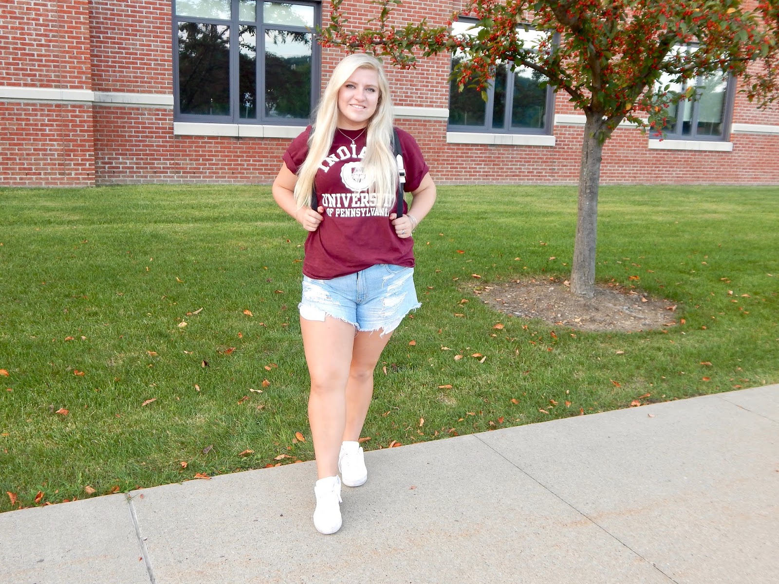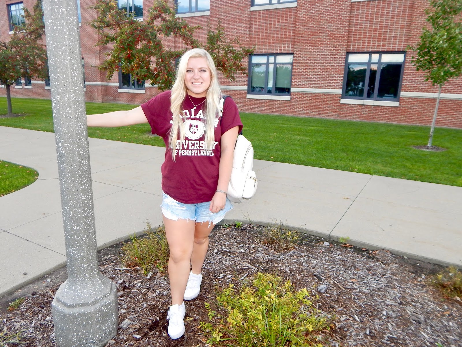 I went from hardly wearing denim shorts this summer to wearing them in two posts in a row! I guess you could say that I am going through a bit of a phase at the moment, at least on the blog. This week, though, I am keeping things light with a light wash, distressed denim. You could already guess that these are high-waisted, but what I like most about these shorts is the color. The majority of my denim is dark or medium wash, so it is nice to switch things up. I suppose I am so picky about light washes because there are so many different variations and shades. For me, it is hard to find a pair that goes with my skin tone. Don’t you worry because these shorts are flattering in so many ways; they look great on all complexions and the high-waist style makes your legs look miles long. The ripped detail is very current and complements the chill college kid aesthetic. I chose this color to contrast with the darker crimson top, but depending on your school colors and/or preference, you can comb those closets for shorts or jeans that are different washes and styles.