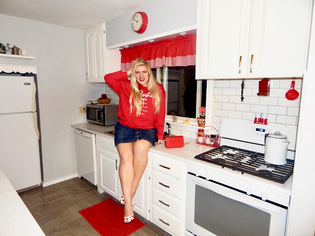 Hey there, loves! Happy Hallo-week! While everyone has been attending haunted houses and watching horror films, I have been in the kitchen of the Barbie dream house, preparing for a fabulous Halloween! Haha! Well, technically it is the kitchen at the Prutznal household, but I helped redesign it this summer, so it is a dream (if you need an interior designer, come my way)! When I was thinking of locations to shoot, I thought our new kitchen had the perfect mix of retro and modern, with red accessories that really make the space pop! It definitely feels a little 1950s, and Barbie was born in ’59, meaning it was meant to be. I decided to be Barbie this year because I found this crewneck by accident, fell in love, and decided this all must be fate! I wore a red Barbie City crewneck, a button-front denim skirt, lip heels, and a shiny patent leather bag. I love this look because it doubles as a costume or an everyday outfit! I like to spend money on pieces that I can wear different ways for different occasions, and it doesn’t get more classic than Barbie! Call me a little obsessed, but there is no denying the fact that Barbara Millicent Roberts (yes, she has a full name) is a style icon. Let me tell you, my dolls had quite the wardrobe, so who better to be for Halloween than the first fashionista who started it all?! Whether you are a fan or not, I will convince you that being a Barbie girl for Halloween is a great idea because life in plastic is fantastic (at least on October 31st)!!