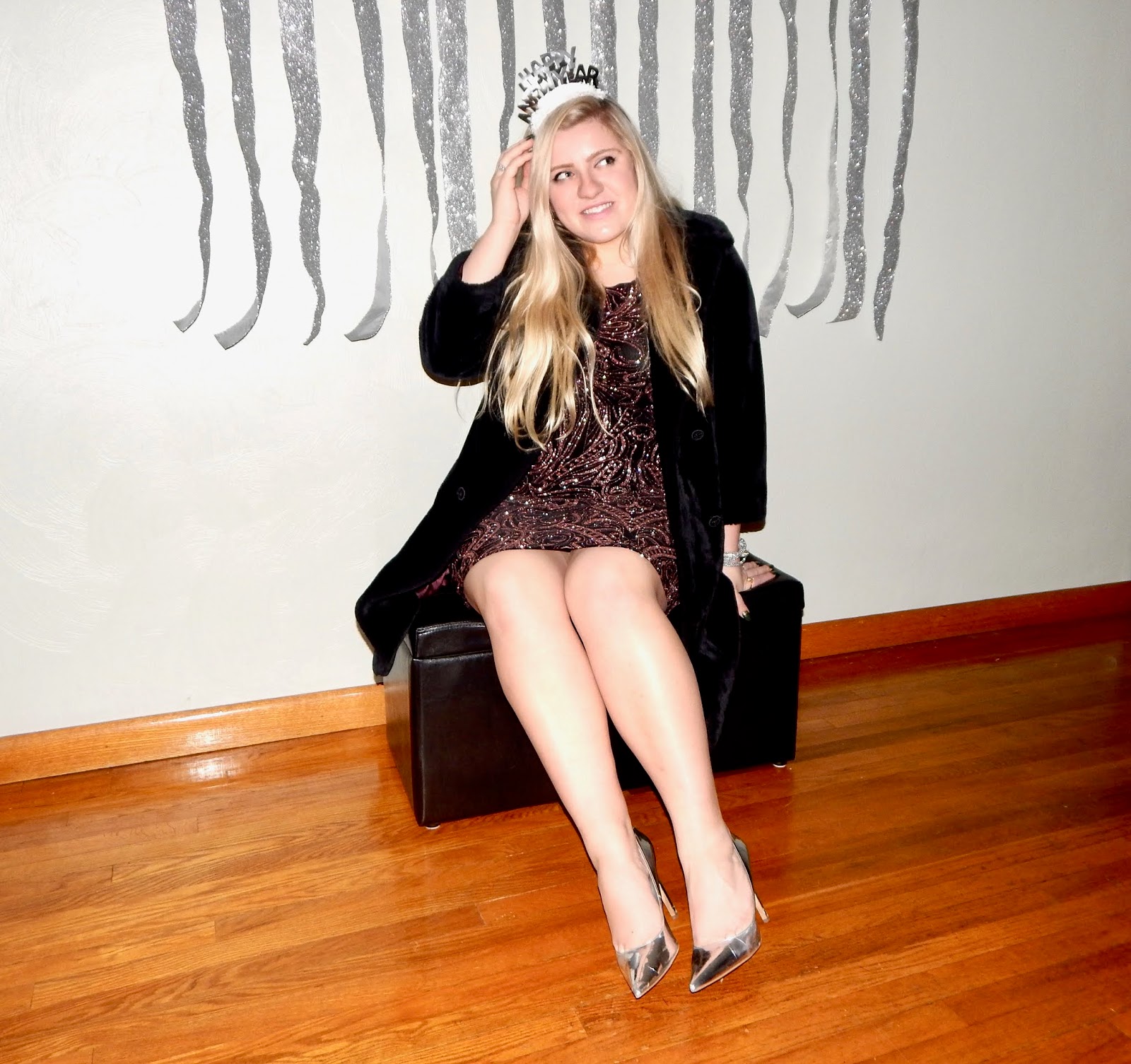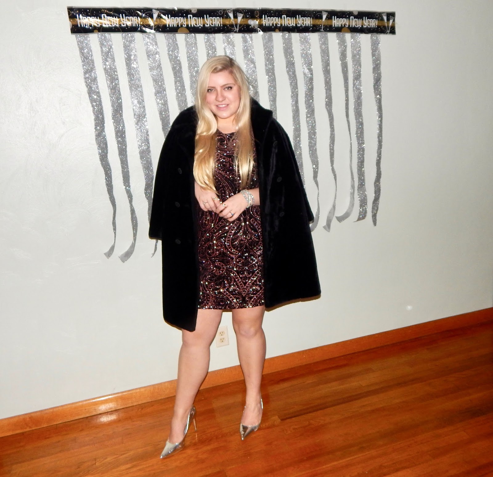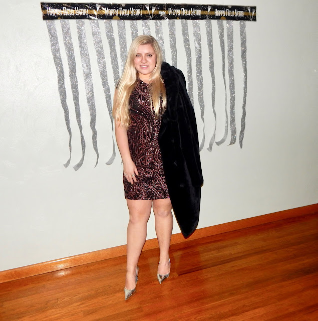 Hey there, lovelies! I hope you all had a wonderful Christmas this year. I was blessed to spend lots of time with family and am so grateful to have made more memories this holiday season. In fact, I was so busy being merry that I had to squeeze in this photoshoot and blogpost at the last minute because I promised you all a look for New Year’s. Unfortunately, I was bummed out that I didn’t have a super glamorous location that had disco balls and glitter everywhere, so I had to do a little improvising. My decorations are more suited for a photobooth, but, on the bright side, I have a whole year to plan for NYE 2019! To be honest, I have always been boring on NYE—I usually just watch the ball drop and play board games, but for all of you who have somewhere fun to be (or who want to be extra fancy when tuning into the NYE coverage on tv), then I have the outfit for you! I chose to wear a glitter pattern body con dress, a faux fur jacket, and some metallic heels that will have you stepping into 2019 on the right foot(wear)! This ensemble is perfect for New Year’s Eve because sparkle is expected when ringing in a new chapter. However, I would not be sad if we made 2019 the year of glitter because I could get used to wearing this! I think NYE is such a fun time because it is a night where you can get as fancy and dolled up as you want, which is the absolute best way to end and begin a year. So, bust out the bubbly, grab your girls, and keep reading to achieve my New Year’s sparkle!