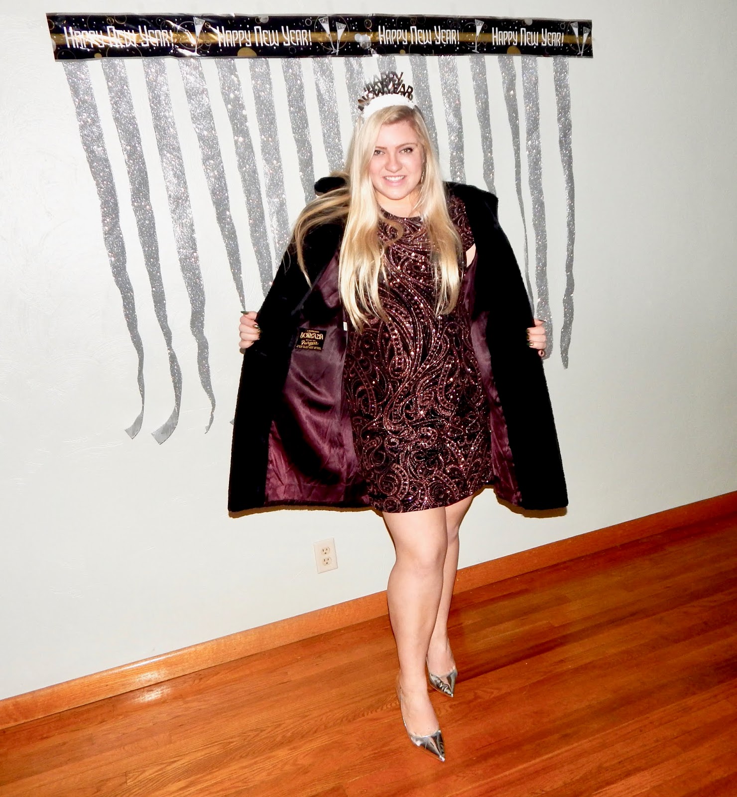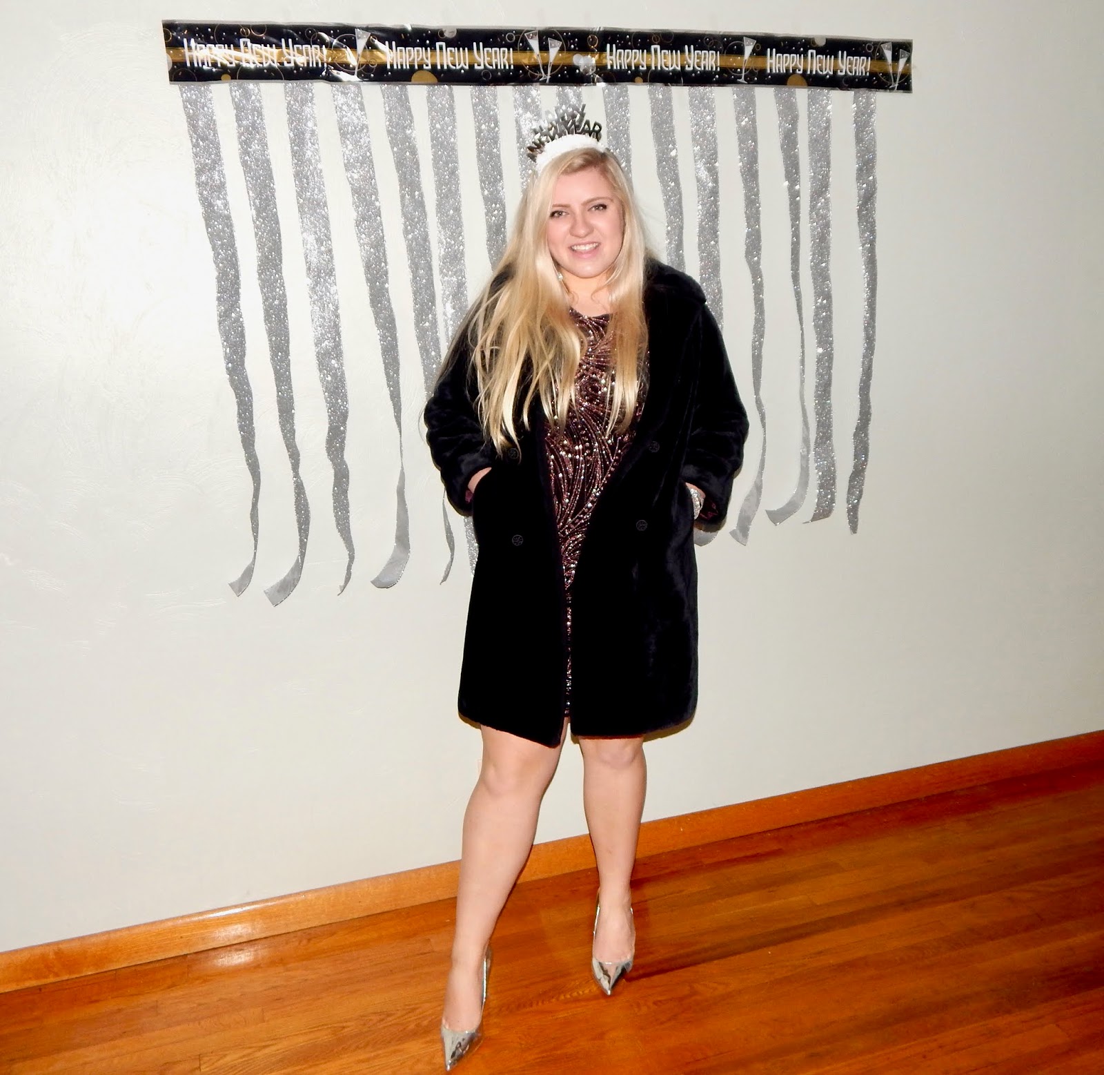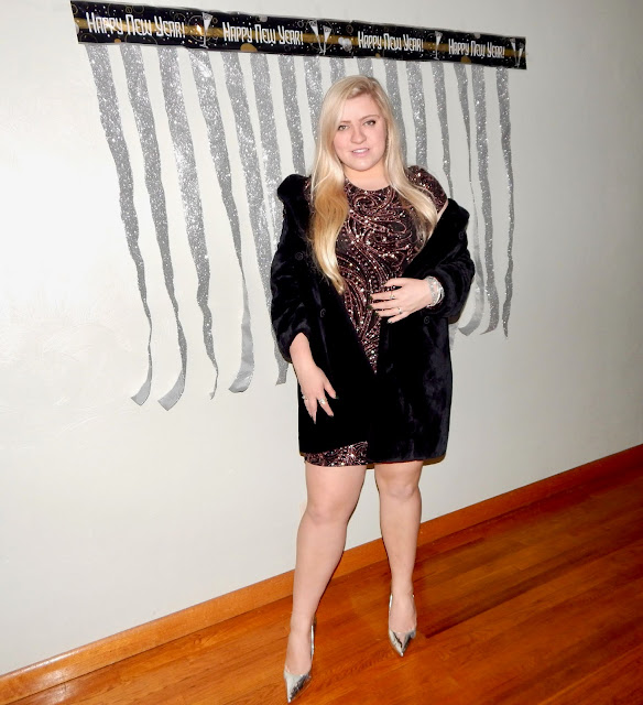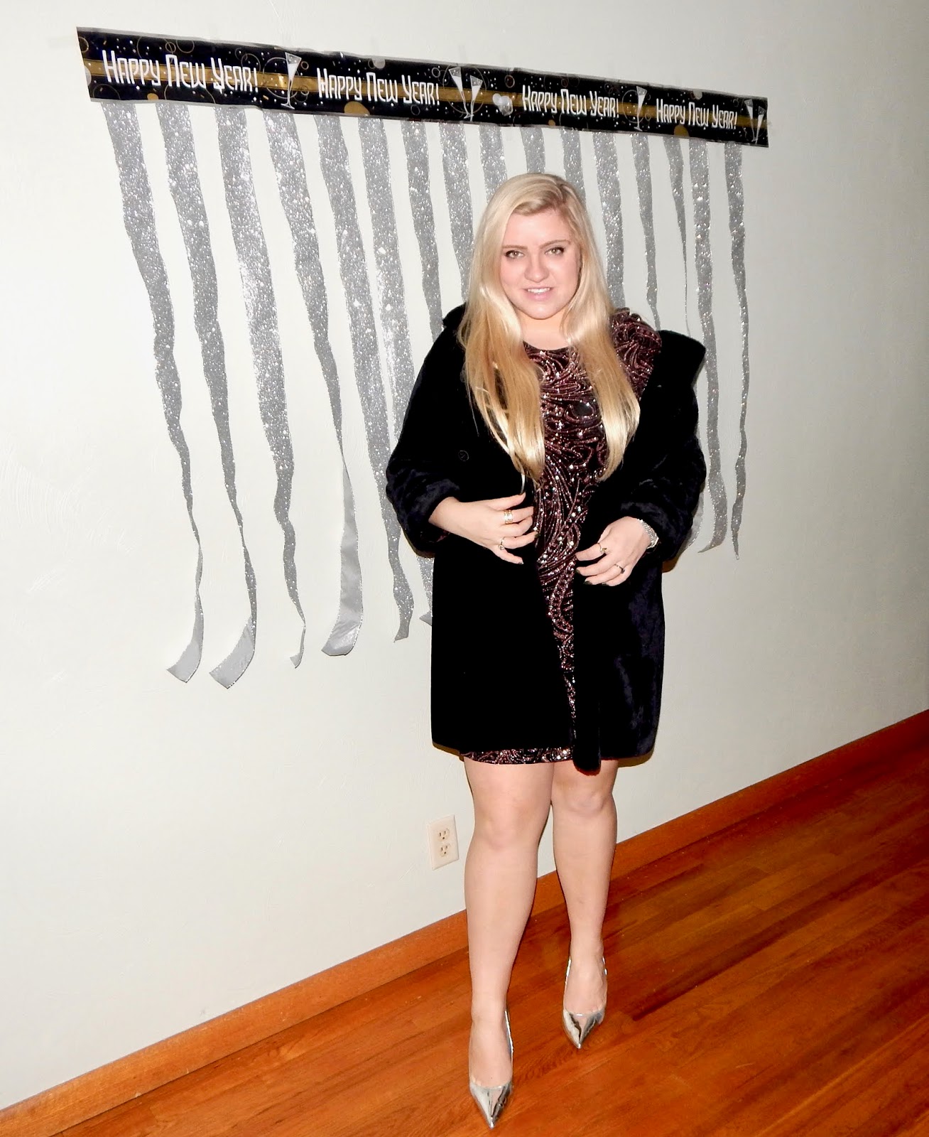 Hey there, lovelies! I hope you all had a wonderful Christmas this year. I was blessed to spend lots of time with family and am so grateful to have made more memories this holiday season. In fact, I was so busy being merry that I had to squeeze in this photoshoot and blogpost at the last minute because I promised you all a look for New Year’s. Unfortunately, I was bummed out that I didn’t have a super glamorous location that had disco balls and glitter everywhere, so I had to do a little improvising. My decorations are more suited for a photobooth, but, on the bright side, I have a whole year to plan for NYE 2019! To be honest, I have always been boring on NYE—I usually just watch the ball drop and play board games, but for all of you who have somewhere fun to be (or who want to be extra fancy when tuning into the NYE coverage on tv), then I have the outfit for you! I chose to wear a glitter pattern body con dress, a faux fur jacket, and some metallic heels that will have you stepping into 2019 on the right foot(wear)! This ensemble is perfect for New Year’s Eve because sparkle is expected when ringing in a new chapter. However, I would not be sad if we made 2019 the year of glitter because I could get used to wearing this! I think NYE is such a fun time because it is a night where you can get as fancy and dolled up as you want, which is the absolute best way to end and begin a year. So, bust out the bubbly, grab your girls, and keep reading to achieve my New Year’s sparkle!