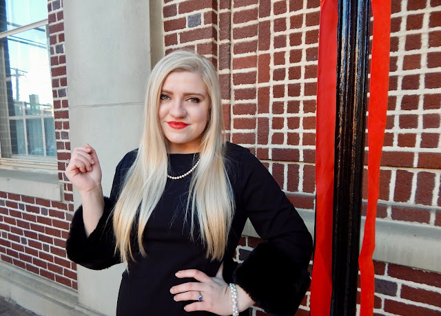 Hi lovelies! It is so crazy to think that Christmas is only days away! Now that all my finals are over, I can fully get into the festive spirit, and the only thing I am stressing about is getting my presents put together and cookies baked! In the midst of the holiday chaos, I still managed to style a chic look for all of the fun and family gatherings. This season is the perfect time of year to get extra glam with luxe textures, sleek silhouettes, and a touch of sparkle. As someone who always finds a reason to dress up, I take advantage of every excuse to bust out my fanciest of ‘fits! A fun fact about me is that I buy a new outfit every holiday season to celebrate (literally since I was born my parents have treated me to a new dress or skirt)—I guess you could say Merry Christmas to me! Even though I debut a new look each year, I usually find pieces on amazing sale after the season and save them for upcoming December. Basically, they sit in my closet for a while, so I have to be careful not to overindulge in the Christmas cookies to ensure they still fit! I have been saving this dress since March, and I am more than ready to zip it up and be on my merry way! I kept things classic this Christmas, pairing this faux fur cuff sheath dress with black heels, a string of pearls, and a red lip (you never know when you will stumble upon some mistletoe)! I love this look because it is not only fitting for the holidays, but for any occasion that requires more formal attire! Wear this to a wedding, dinner party, date, or dance for a tasteful, yet stylish look. But for now, cue the Christmas tunes and keep on scrolling because ’tis the season to be dressed in holiday style!