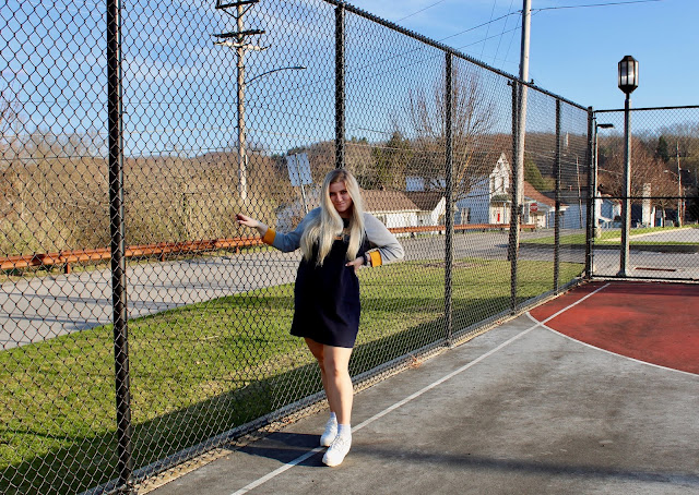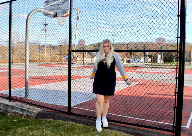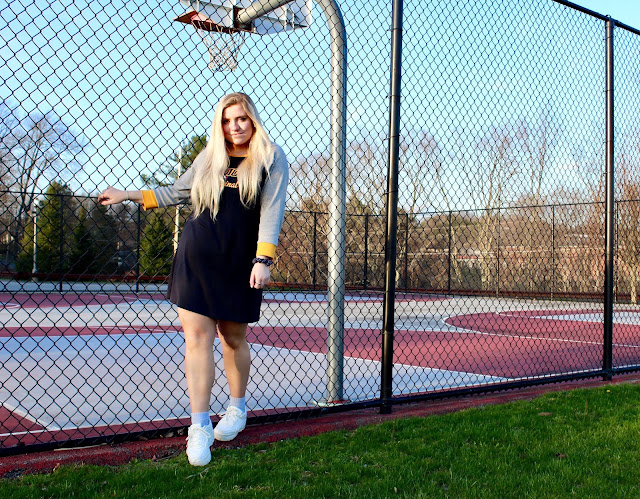Hi loves! Can you believe April is halfway over already?! I feel like it was just April Fool’s Day! I actually only got *pranked* one time this year—my dad asked me why I was leaving the house with ripped pants. Of course, I fell for it like I do every time. Luckily, my pants were in mint condition, so I could leave without fear of a wardrobe malfunction (only to go to my apartment by myself, so I guess it wouldn’t have mattered if they were ripped)! I’ve been using my college apartment as a little “getaway” because my lease isn’t up until the end of the semester. I take a mini road trip (it’s about 45 min. from home), grab some takeout, and usually tackle all the homework I have to catch up on. It’s nice for a change of scenery. As much as I love my chic chateau at college, I also like getting some fresh air to boost my spirits. I go for walks all over town, passing the (sadly empty) b-ball courts, attempting to soak up the small amount of sun we have in PA! Unfortunately, you can’t play basketball on the courts right now, but I only go there for pictures anyway! I lasted 2 weeks on the basketball team, though I’ve always been a great spectator! I chose to style a cute, yet super comfy outfit that can fit your quarantine agenda, and really any agenda that calls for a chic, athleisure look. This Tommy Hilfiger dress paired with chunky “dad” sneakers gives me all the Sporty Spice vibes. And I’ll tell you what I want…what I really, really want—I want you to keep on reading for courtside style tips that will have scoring all kinds of style points!
