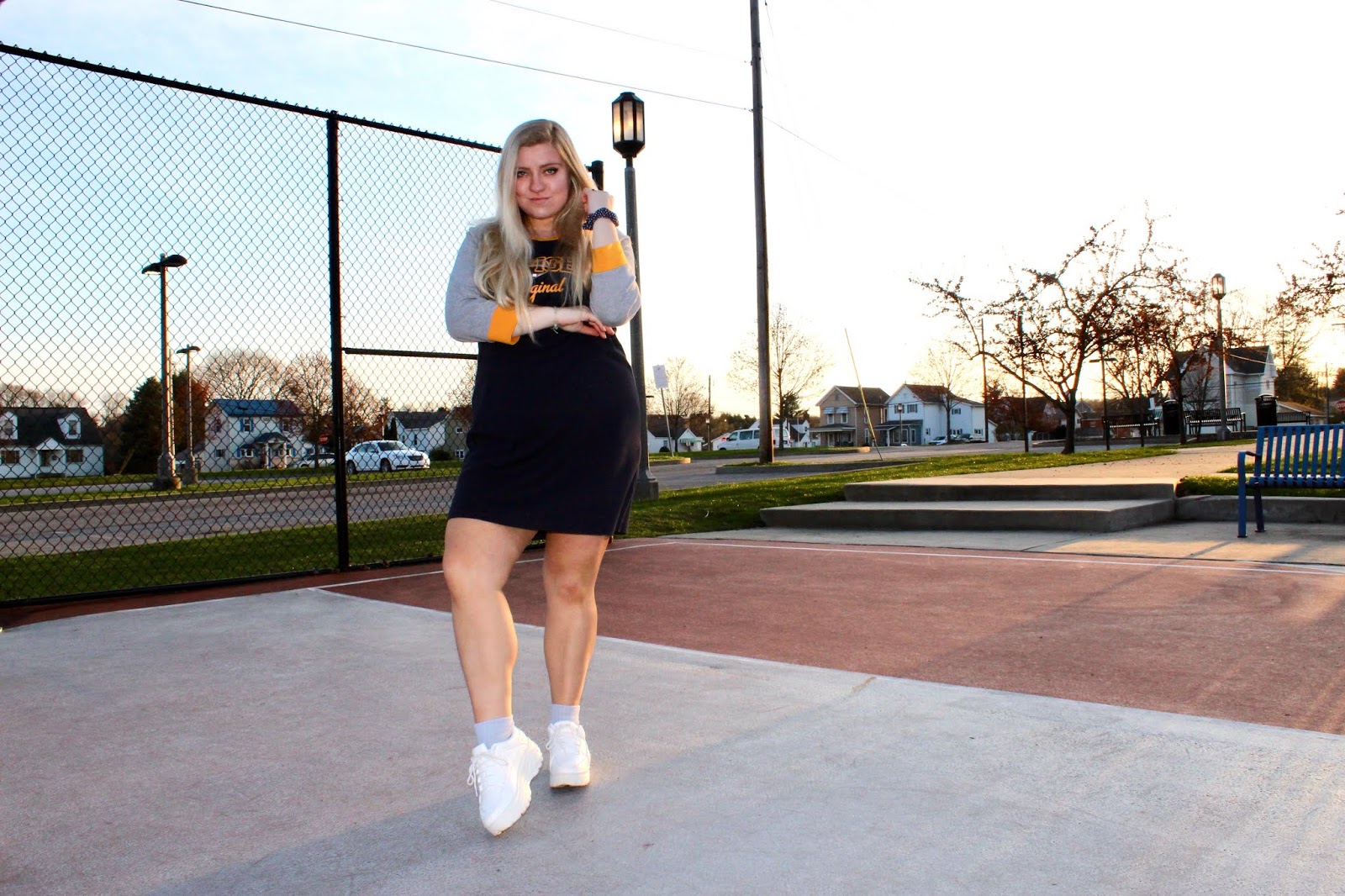 Hi loves! Can you believe April is halfway over already?! I feel like it was just April Fool’s Day! I actually only got *pranked* one time this year—my dad asked me why I was leaving the house with ripped pants. Of course, I fell for it like I do every time. Luckily, my pants were in mint condition, so I could leave without fear of a wardrobe malfunction (only to go to my apartment by myself, so I guess it wouldn’t have mattered if they were ripped)! I’ve been using my college apartment as a little “getaway” because my lease isn’t up until the end of the semester. I take a mini road trip (it’s about 45 min. from home), grab some takeout, and usually tackle all the homework I have to catch up on. It’s nice for a change of scenery. As much as I love my chic chateau at college, I also like getting some fresh air to boost my spirits. I go for walks all over town, passing the (sadly empty) b-ball courts, attempting to soak up the small amount of sun we have in PA! Unfortunately, you can’t play basketball on the courts right now, but I only go there for pictures anyway! I lasted 2 weeks on the basketball team, though I’ve always been a great spectator! I chose to style a cute, yet super comfy outfit that can fit your quarantine agenda, and really any agenda that calls for a chic, athleisure look. This Tommy Hilfiger dress paired with chunky “dad” sneakers gives me all the Sporty Spice vibes. And I’ll tell you what I want…what I really, really want—I want you to keep on reading for courtside style tips that will have scoring all kinds of style points!