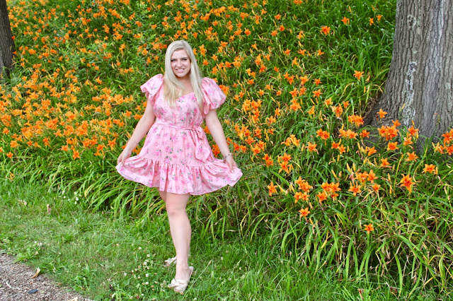 Hi loves! I hope you’re all surviving the July heatwave! I have been spending most of my days by the pool and basically living in swimwear. Every once in a while, you can find me in actual clothes, though! I love any excuse to dress up and feel fancy, even if it’s just for a floral photoshoot. Obviously, this LoveShackFancy X Target dress is the definition of fancy with its whimsical silhouette and feminine color palette. When you put it on, you truly feel like a princess! In the midst of all the chaos and tragedy of 2020, it’s time to write your own fairytale filled with joy, adventure, and fashion, of course. If I could live the storybook lifestyle, I would definitely have a white marble castle with a huge walk-in closet and plenty of space for Maxie (my kitty)—and I suppose a little room for the prince, too. For now, this dress has to satisfy all of my fashionable fantasies! I chose to style it simply with dainty layers of gold/rose gold jewelry and champagne bow slides for chic shoes that are super comfy and easy to wear. An outfit this pretty is perfect for summer weddings, bridal/baby showers, birthdays, date night, etc. It would also be so cute to wear to a backyard tea party with your girls (totally just thought of this idea right now and am convinced I need to make this happen ASAP…who’s coming??!)! The point is, don’t let the frills fool you because you can flaunt fancy looks for every occasion. There’s no such thing as being overdressed, right?! Keep on reading for the darling details of this look that belongs in a fairytale book!