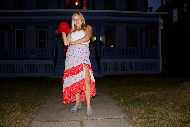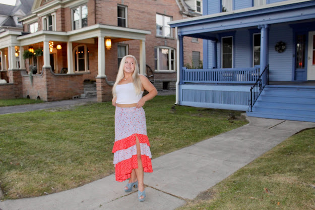 Hats really are an underrated accessory because they are so chic and such an easy way to elevate your ensemble. Sure, it’s also quite simple to accessorize with a bracelet or a belt, but hats are for you fashionistas who want to keep things interesting with a bolder statement. I like brightly colored hats, like this red, wide-brim floppy hat, that adds an extra pop of color. Of course, this look is clearly very colorful, but the hat is the perfect balancing piece. The skirt has so much volume, so a big hat is the best way to match the bottom half! Because the top is simple, the hat isn’t too overpowering in this look, but rather the icing on the cake. With the hat and skirt combo, the entire look gives me old fashion vibes (and the Victorian mansions also help to set the scene), because variations of hats and longer skirts were very much a large part of womenswear for centuries. I remember my grandma telling me about how women had to have their heads covered for church, so people of her generation always had an array of hats for their Sunday Best outfits. This look mixes vintage charm with modern touches like a crop top and high slit! If you’re looking to accessorize, opt for a big hat like me, or try some textured barrettes or a hair ribbon to top off the outfit!