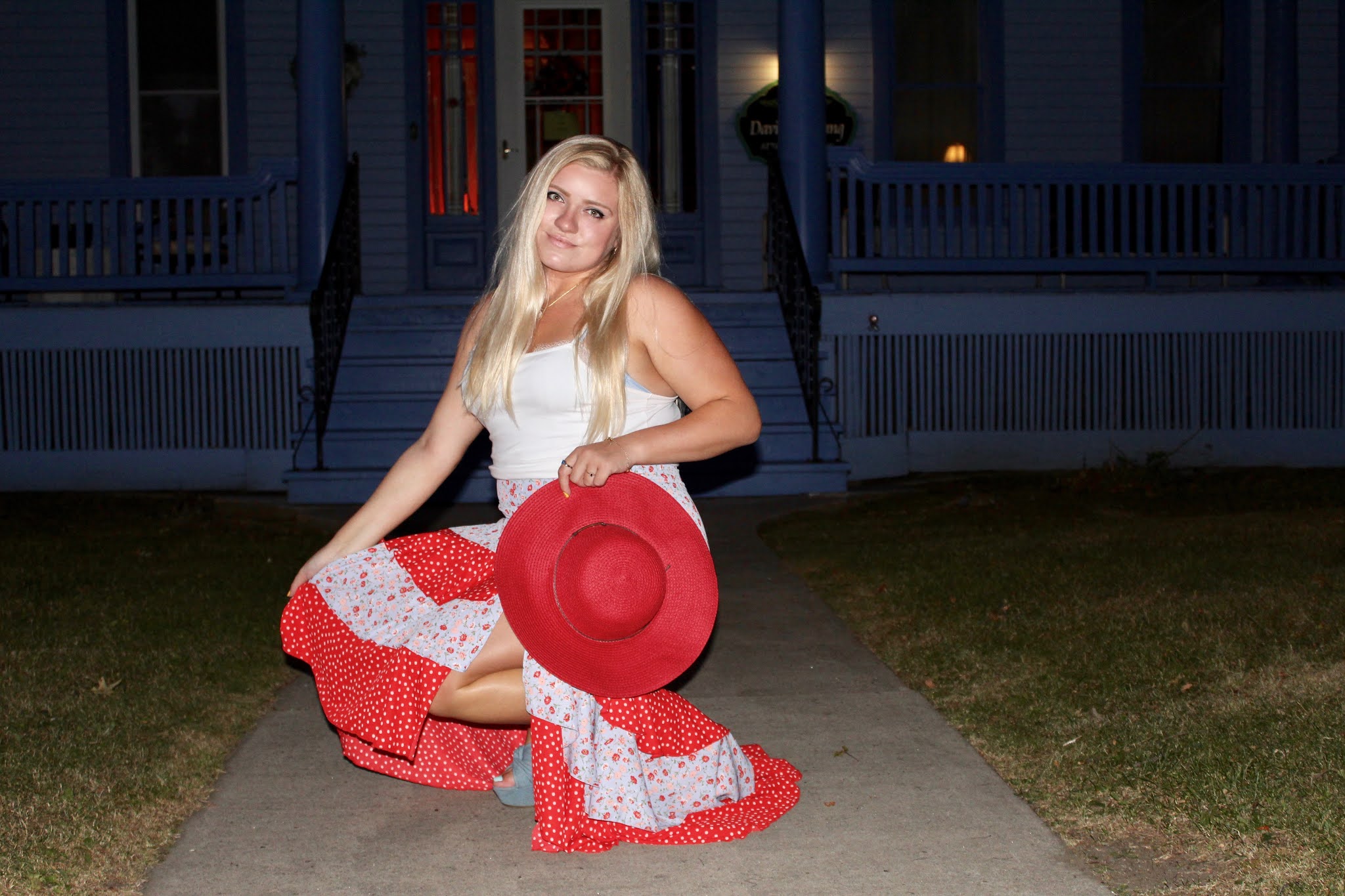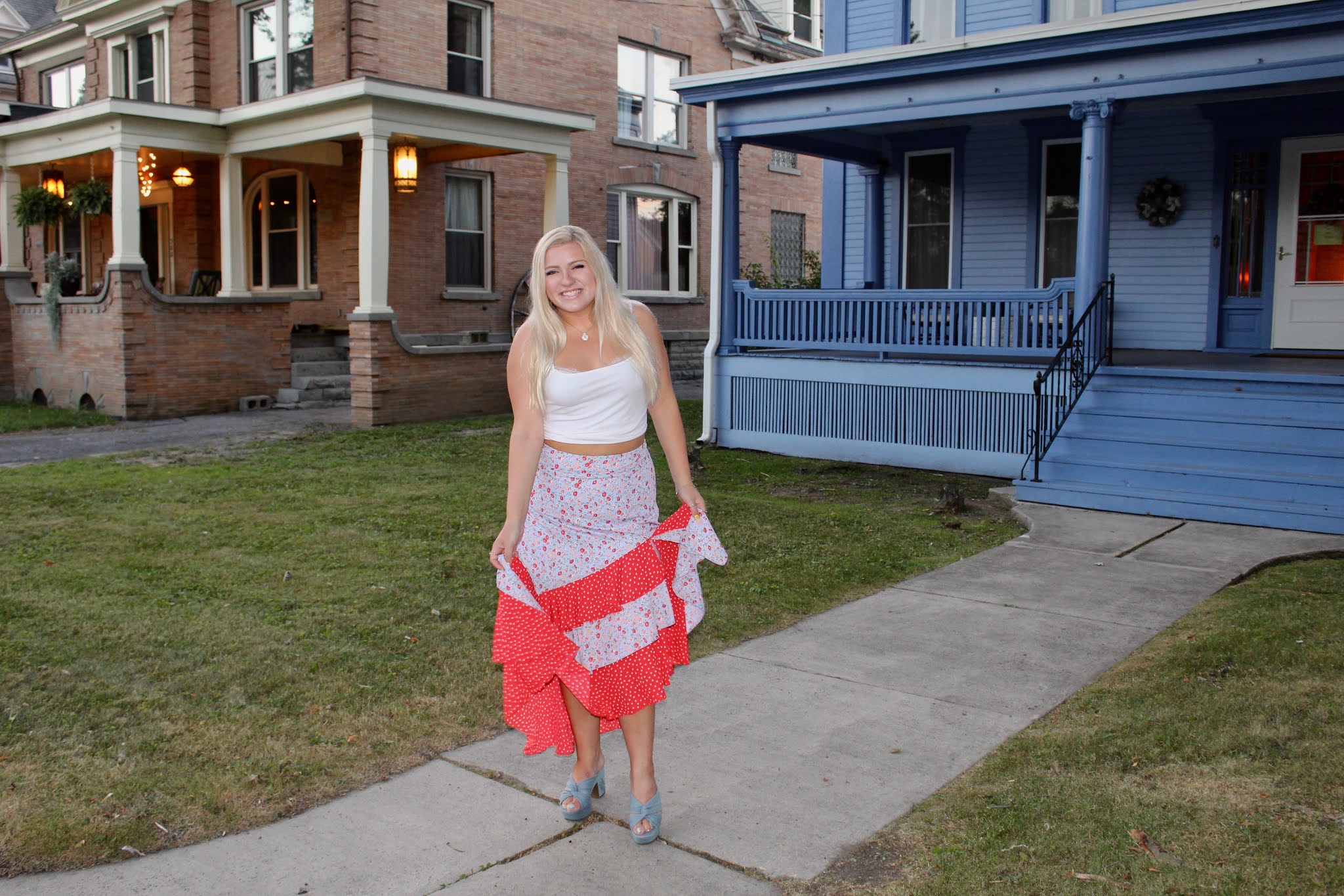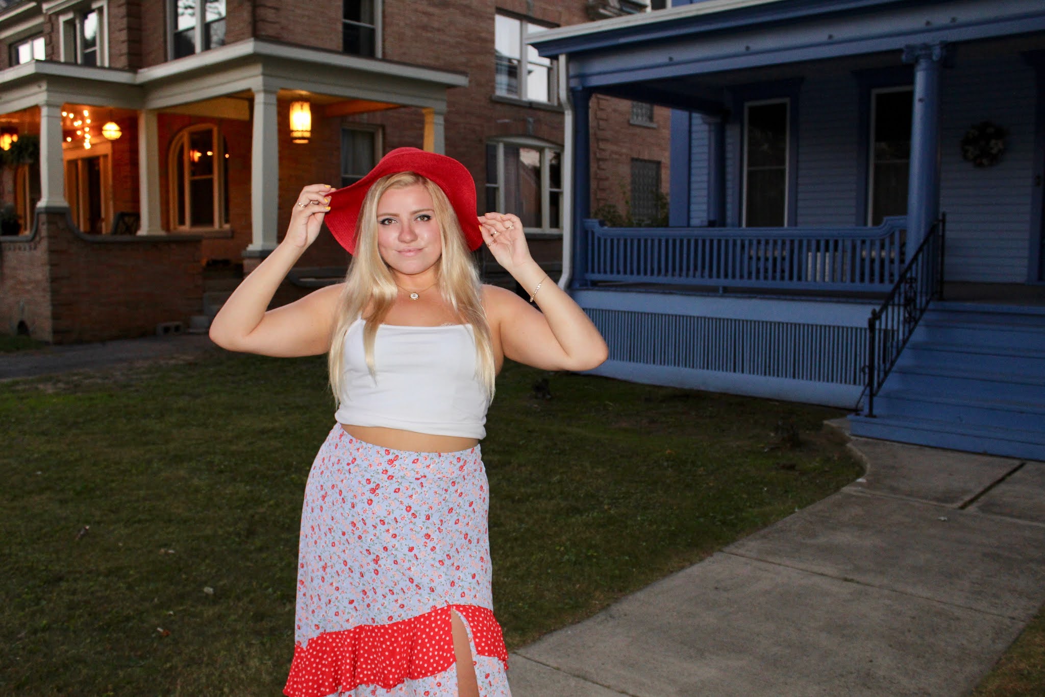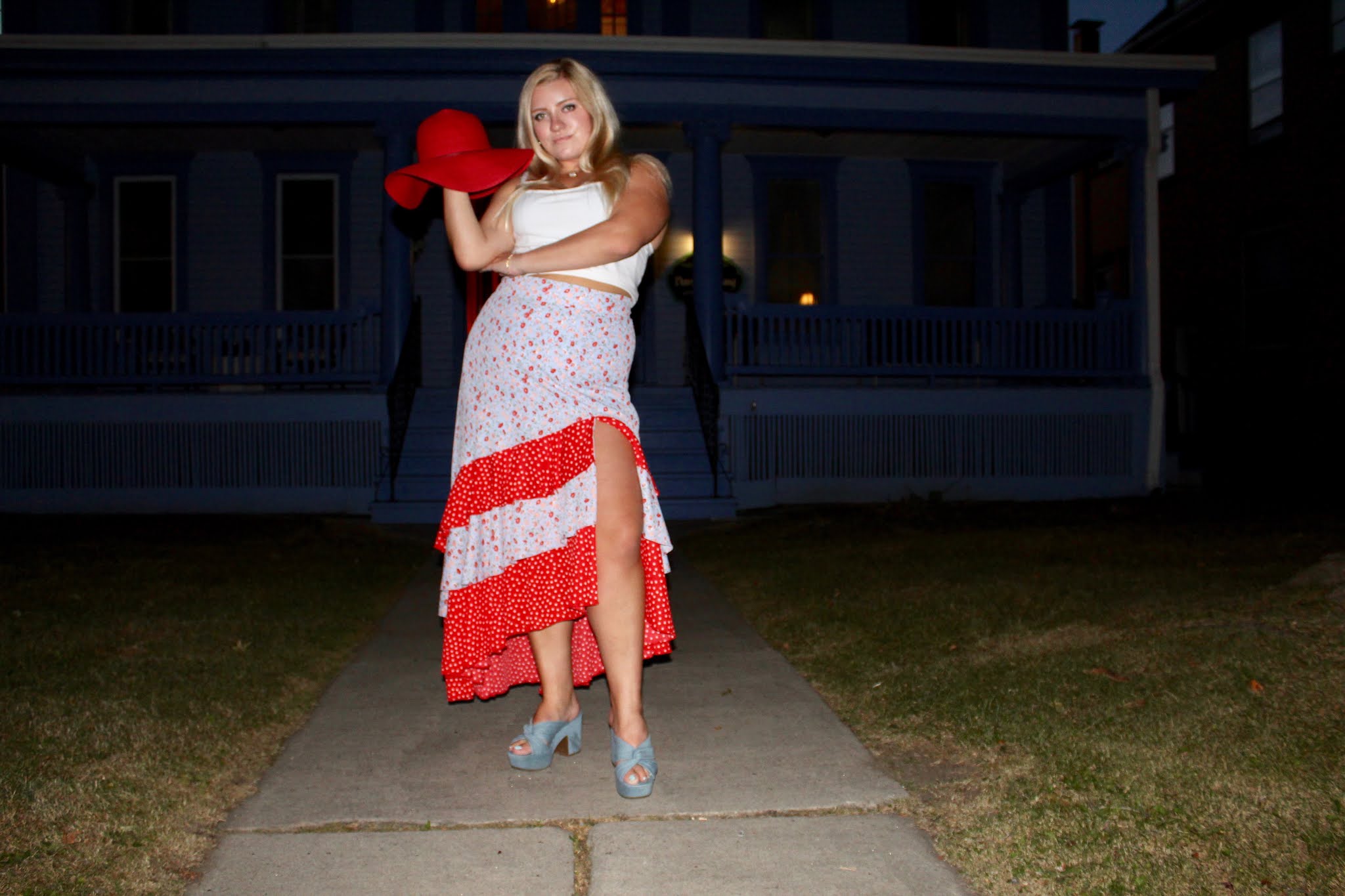 Hats really are an underrated accessory because they are so chic and such an easy way to elevate your ensemble. Sure, it’s also quite simple to accessorize with a bracelet or a belt, but hats are for you fashionistas who want to keep things interesting with a bolder statement. I like brightly colored hats, like this red, wide-brim floppy hat, that adds an extra pop of color. Of course, this look is clearly very colorful, but the hat is the perfect balancing piece. The skirt has so much volume, so a big hat is the best way to match the bottom half! Because the top is simple, the hat isn’t too overpowering in this look, but rather the icing on the cake. With the hat and skirt combo, the entire look gives me old fashion vibes (and the Victorian mansions also help to set the scene), because variations of hats and longer skirts were very much a large part of womenswear for centuries. I remember my grandma telling me about how women had to have their heads covered for church, so people of her generation always had an array of hats for their Sunday Best outfits. This look mixes vintage charm with modern touches like a crop top and high slit! If you’re looking to accessorize, opt for a big hat like me, or try some textured barrettes or a hair ribbon to top off the outfit!