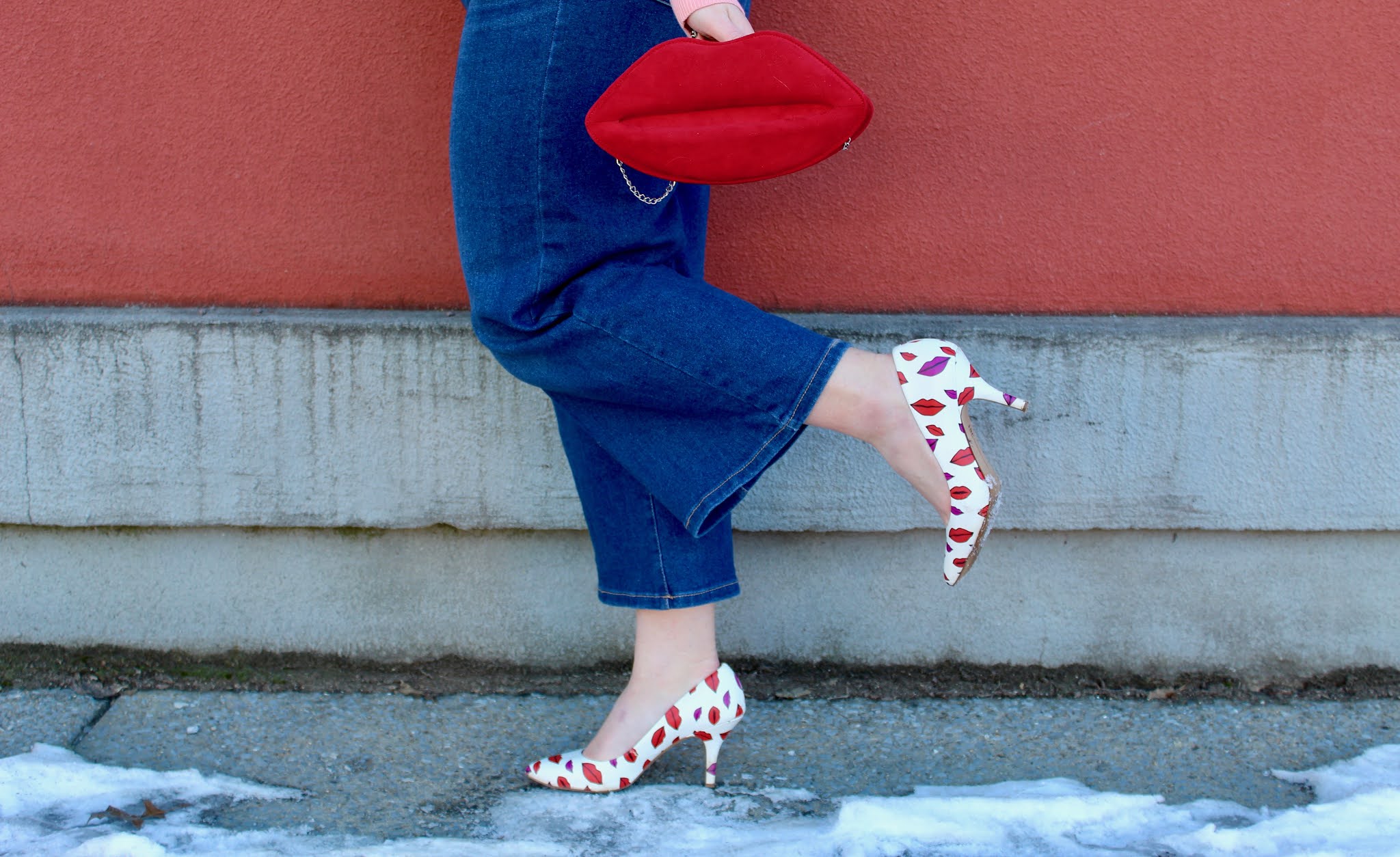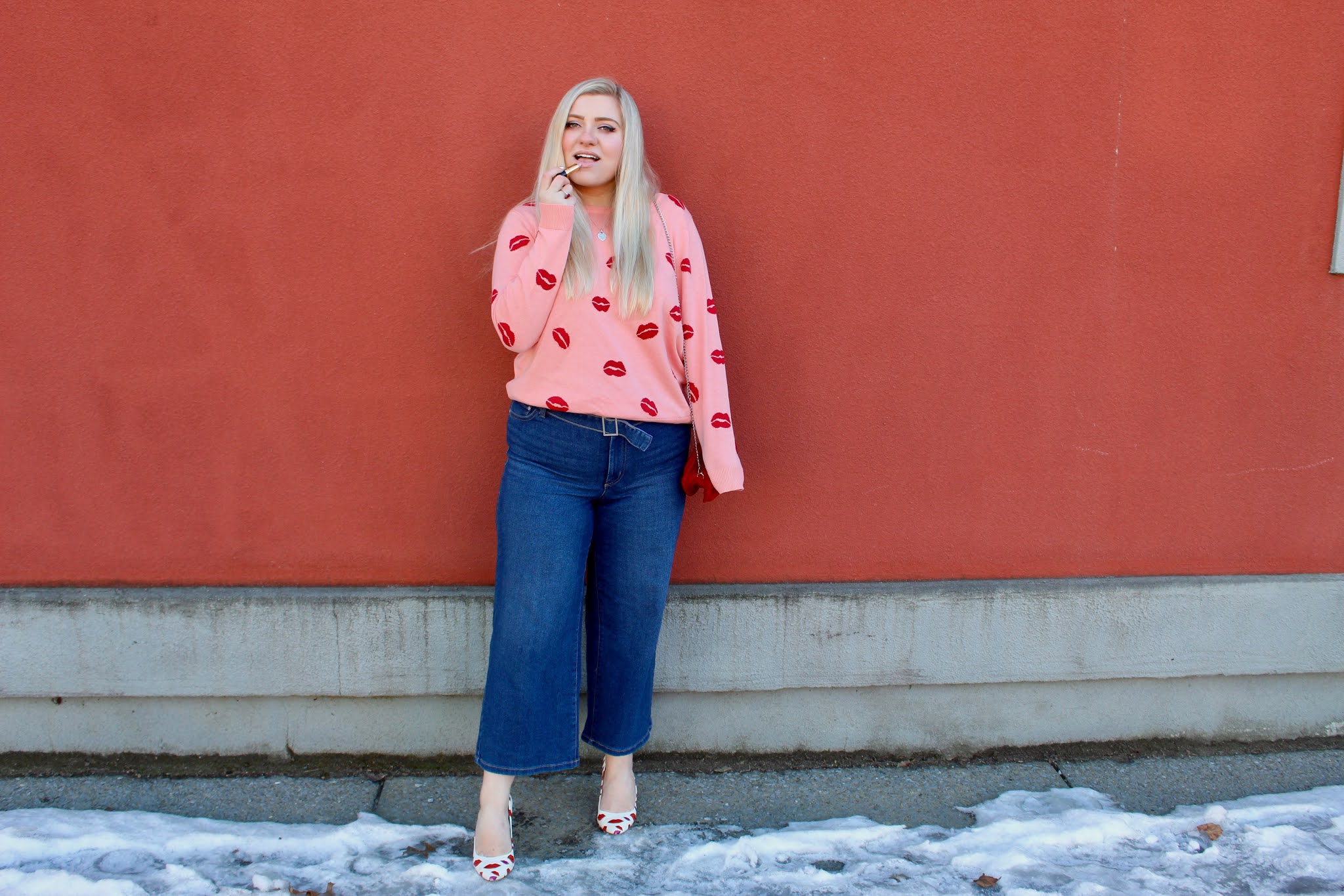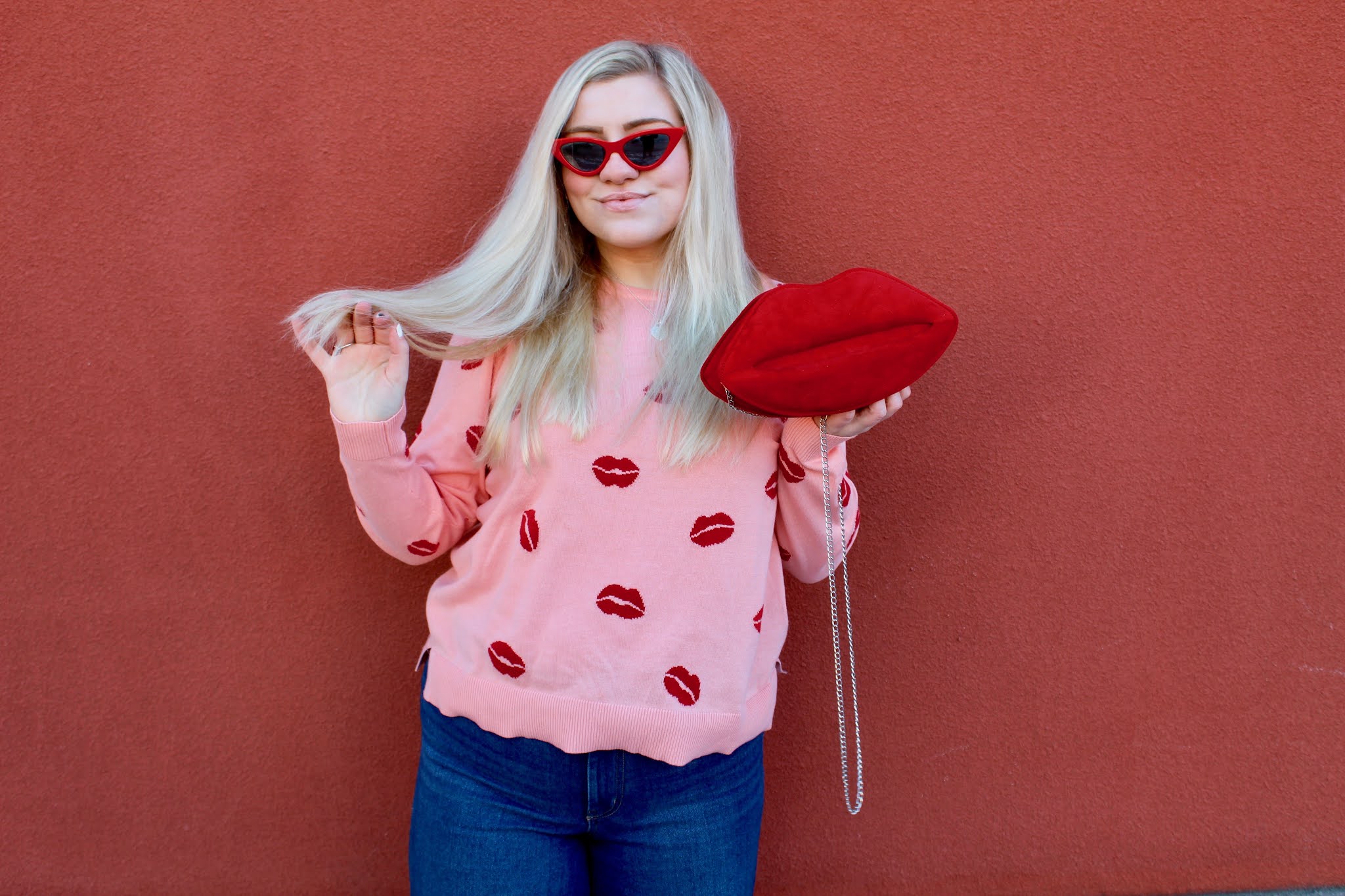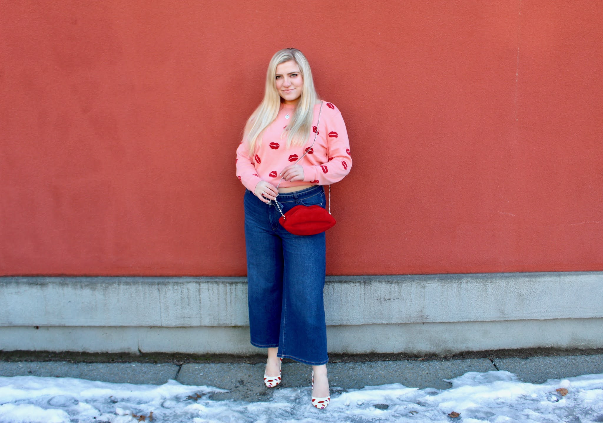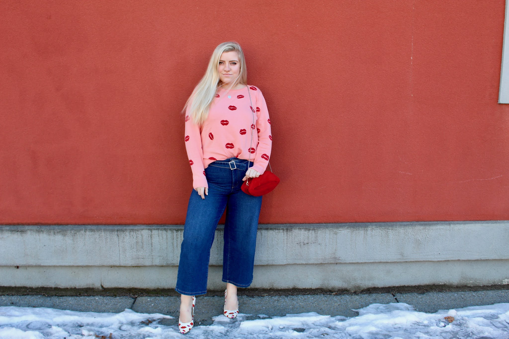 Hey lovelies! I am getting in gear for Valentine’s over here! I always get excited about dressing for V-day because I love anything that is pink, red, and/or covered in hearts or kisses! Plus, I also don’t mind chocolate and teddy bears! Though I tend to not focus on the romantic aspect of the holiday, I will say that I am looking forward to doing some cute things with my Valentine this year…I am going to attempt pink hot chocolate, so stay tuned to read about how it turns out. I don’t doubt it will look adorable, but I am anxious to taste it. If anything, it will make for a cute picture and fit the ~aesthetic~! You already know I have my outfit planned, but I have outfits ready for all of Valentine’s week! Honestly, I could probably dress festively for the entire month of February! I wanted to share some outfit inspiration for you all, with pieces that can be dressed up or down, no matter what you have planned for V-day. I chose this cozy sweater (that is much needed in this frigid, 8 degree weather), paired with wide-leg cropped jeans and some accessories with attitude, including a lip purse and matching heels! If you’re having a cozy night in, going to a fancy dinner, or just drinking wine with your galentines, this look can fit anything on your agenda this weekend. So, grab your lipstick and pucker up while you scroll through this getting lippy blogpost!