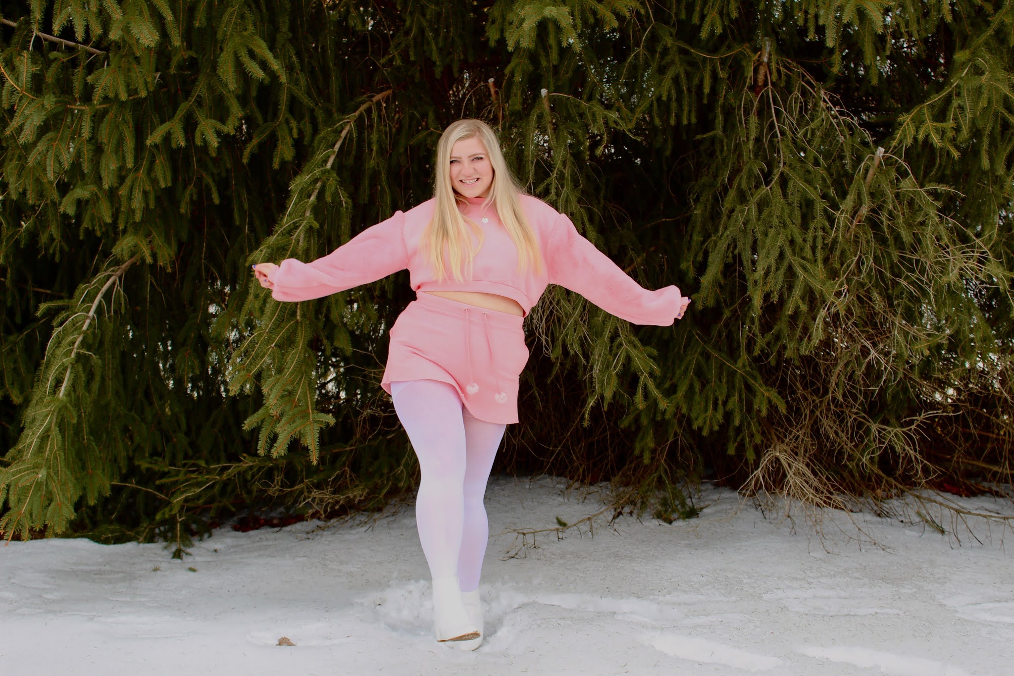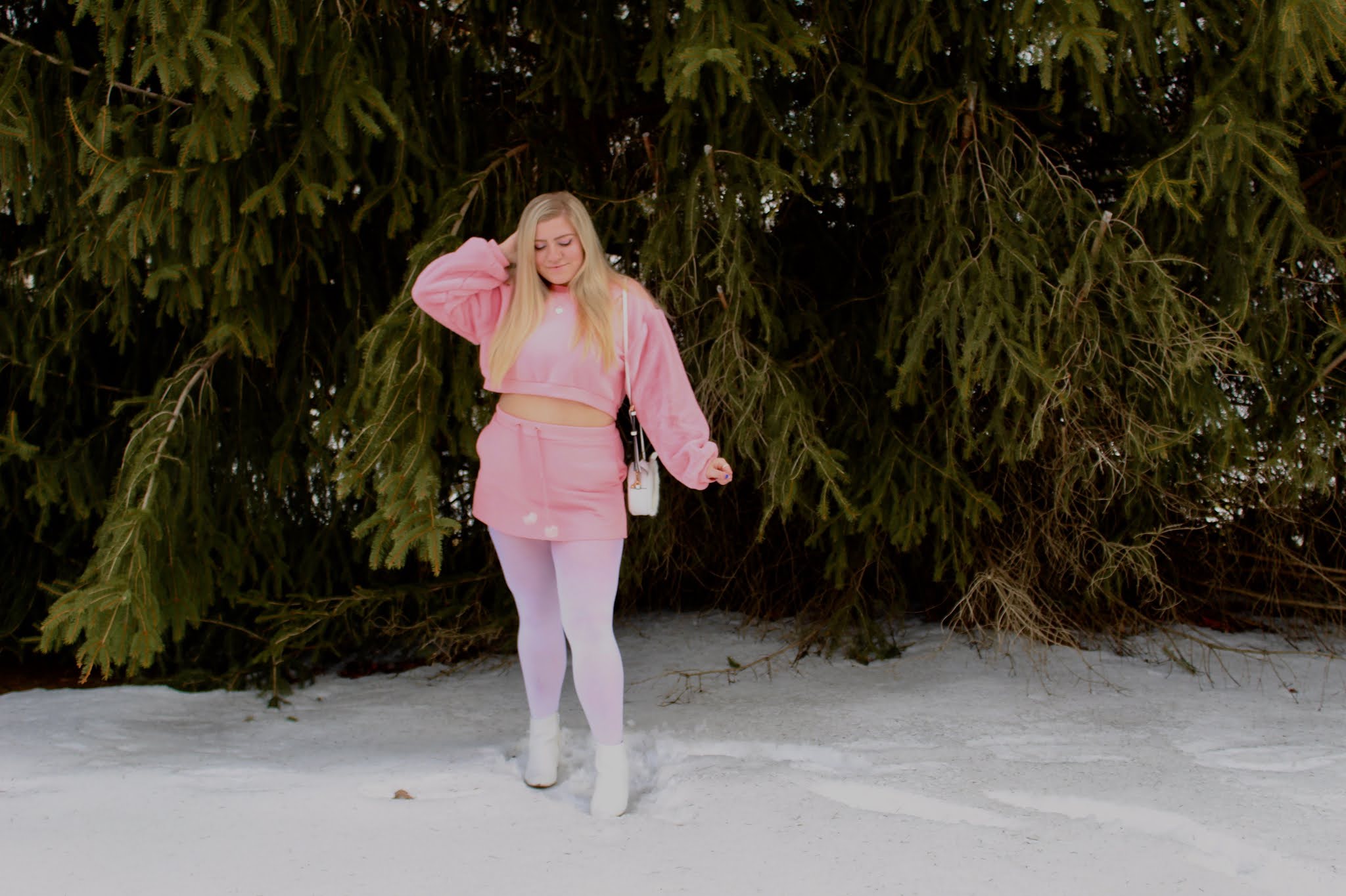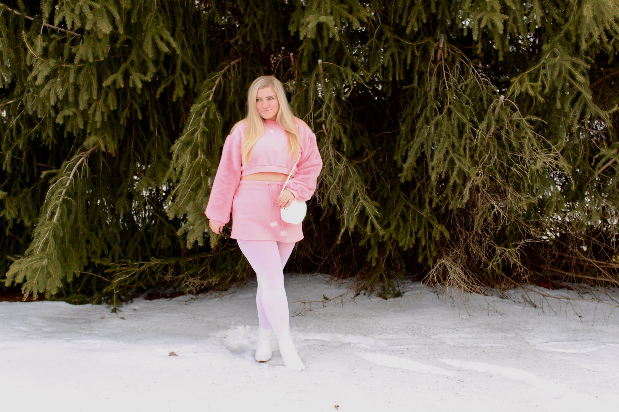 Hey there, loves! It’s hard to believe that March is here, and spring is just around the corner! Spring hasn’t sprung just yet, though, and Pennsylvania is doing a good job at reminding us! It is still a little too cold to put winter fashion to rest, so I am keeping cozy until the weather is rosy. It takes a while for things to defrost around here, including me! I am embracing warm winter clothes while still incorporating hints of spring for a look that is perfect for all you snow bunnies and spring chickens who are itching for color. I will admit that I do spend more time hitting up the mall than I do the slopes, but I have lots of cute outfits if I ever head to Aspen. This look of a cropped crewneck, paired with a matching skirt and styled with white booties and a bag has winter elements like faux fur and thick fabric, but also alludes to spring with the fresh pink color and teeny skirt! I fell in love with this look because it’s fun and flirty for any time you want to stay warm, but also show a little skin. Of course, if the temps aren’t toasty, you will need to throw on tights to complete the look, but white tights add another element to this ensemble. Whether you’re planning on skiing, shopping, or just snapping some cute pics, it’s snow bunny’s business what you do in this ‘fit!